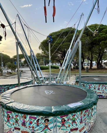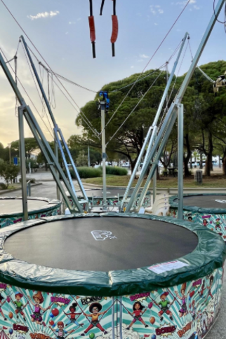 Accrochés de part et d’autre par des élastiques qui amplifient votre saut, vous effectuez des rebonds et figures en toute liberté de mouvement ! Les grands acrobates n’ont qu’à bien se tenir !