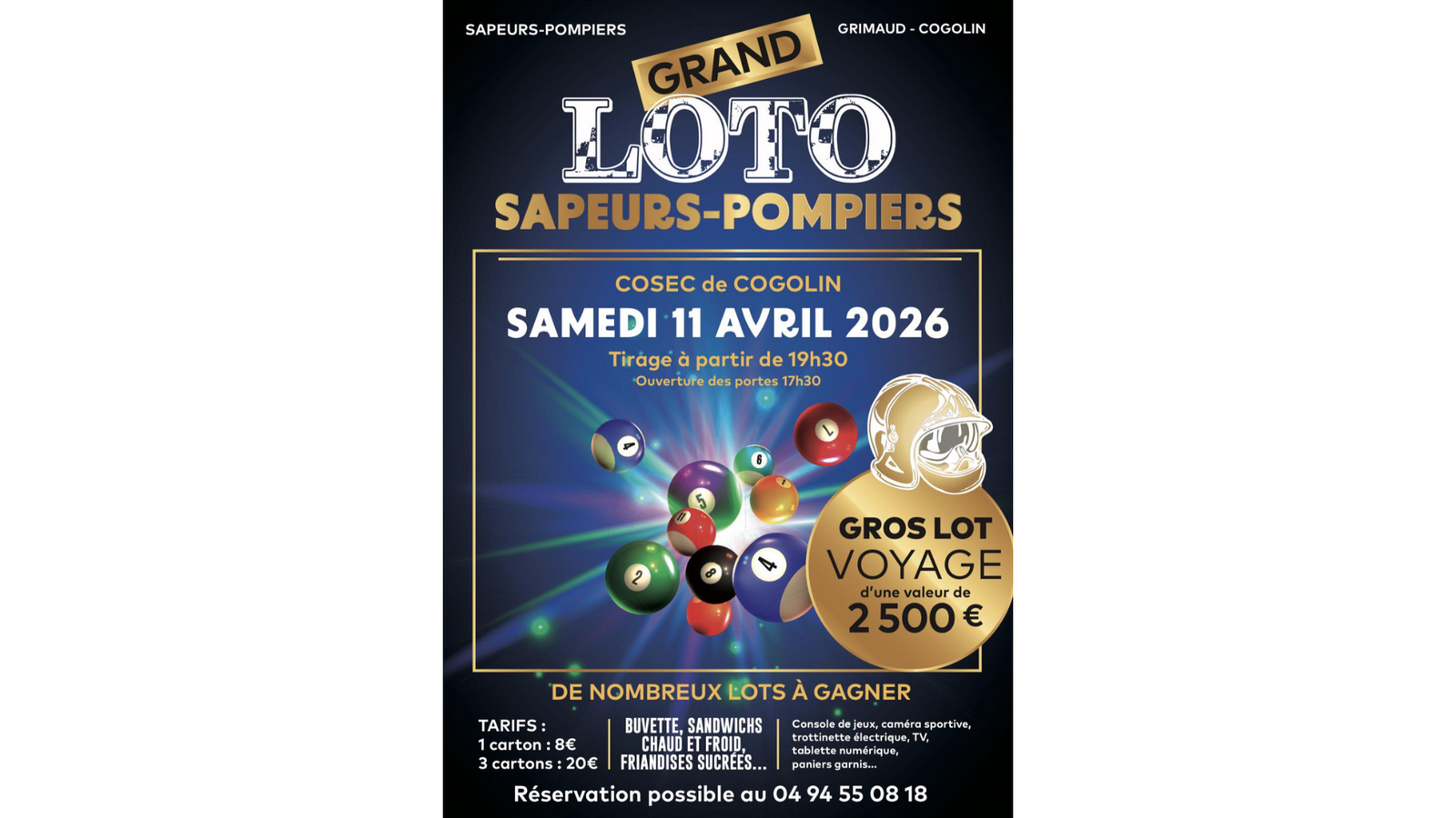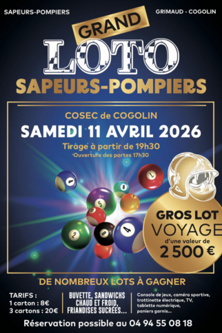 Venez tenter votre chance au grand loto organisé par les sapeurs-pompiers de Grimaud-Cogolin. En plus du gros lot voyage, de nombreux autres lots sont à gagner. Une buvette proposera des sandwichs chauds et froids, ainsi que des friandises sucrées pour vous restaurer sur place.