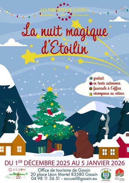 Aide l'ourson à les retrouver pour faire de ces fêtes de Noël un moment magique ! Chaque étape permettra de récupérer une étoile en résolvant une énigme ou un défi.Un livret est disponible à l'office de tourisme qui te permettra de réaliser le parcours. Des étapes te conduisent à travers le village où tu devras résoudre des énigmes, des charades, jouer et observer autour de toi pour réussir la quête. Lorsque l'office est fermé, une boîte contenant des livrets imprimés est disponible à l'extérieur.