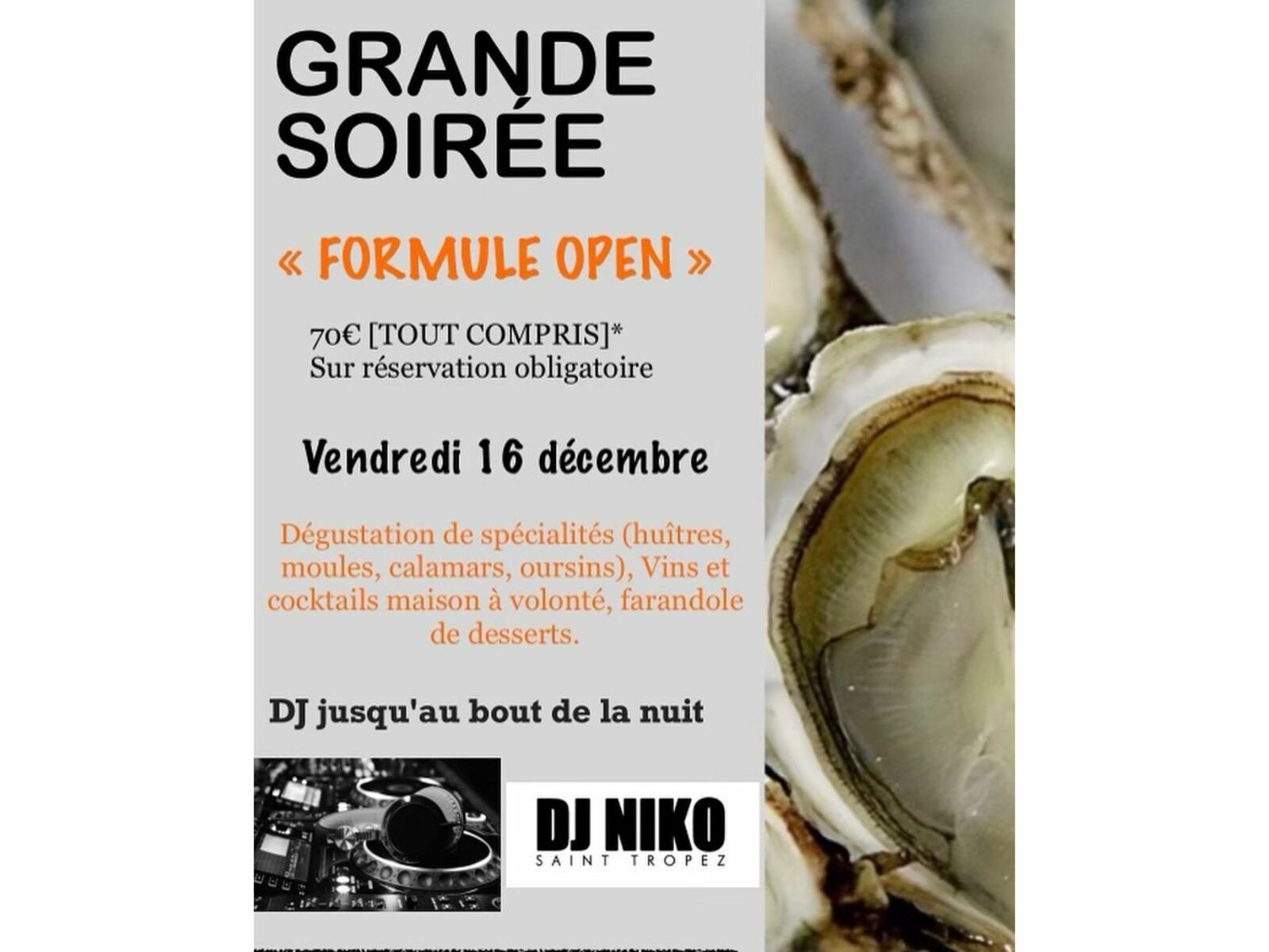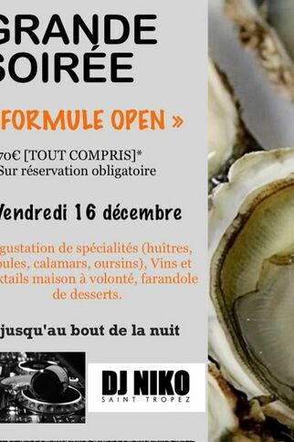 Dégustation de spécialités (huîtres, moules, calamars, oursins), vins et cocktails maison à volonté, farandole de desserts.Soirée animée par DJ Niko