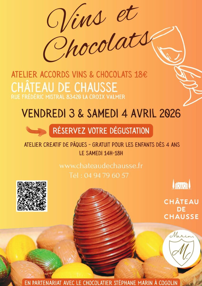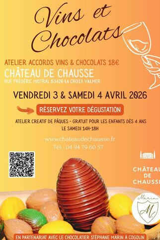 Pour cette quatrième édition, le Château de Chausse et la Chocolaterie Marin de Cogolin s'associent à nouveau afin de vous faire découvrir des accords savoureux.Laissez vous tenter par la découverte harmonieuse du chocolat et du vin.