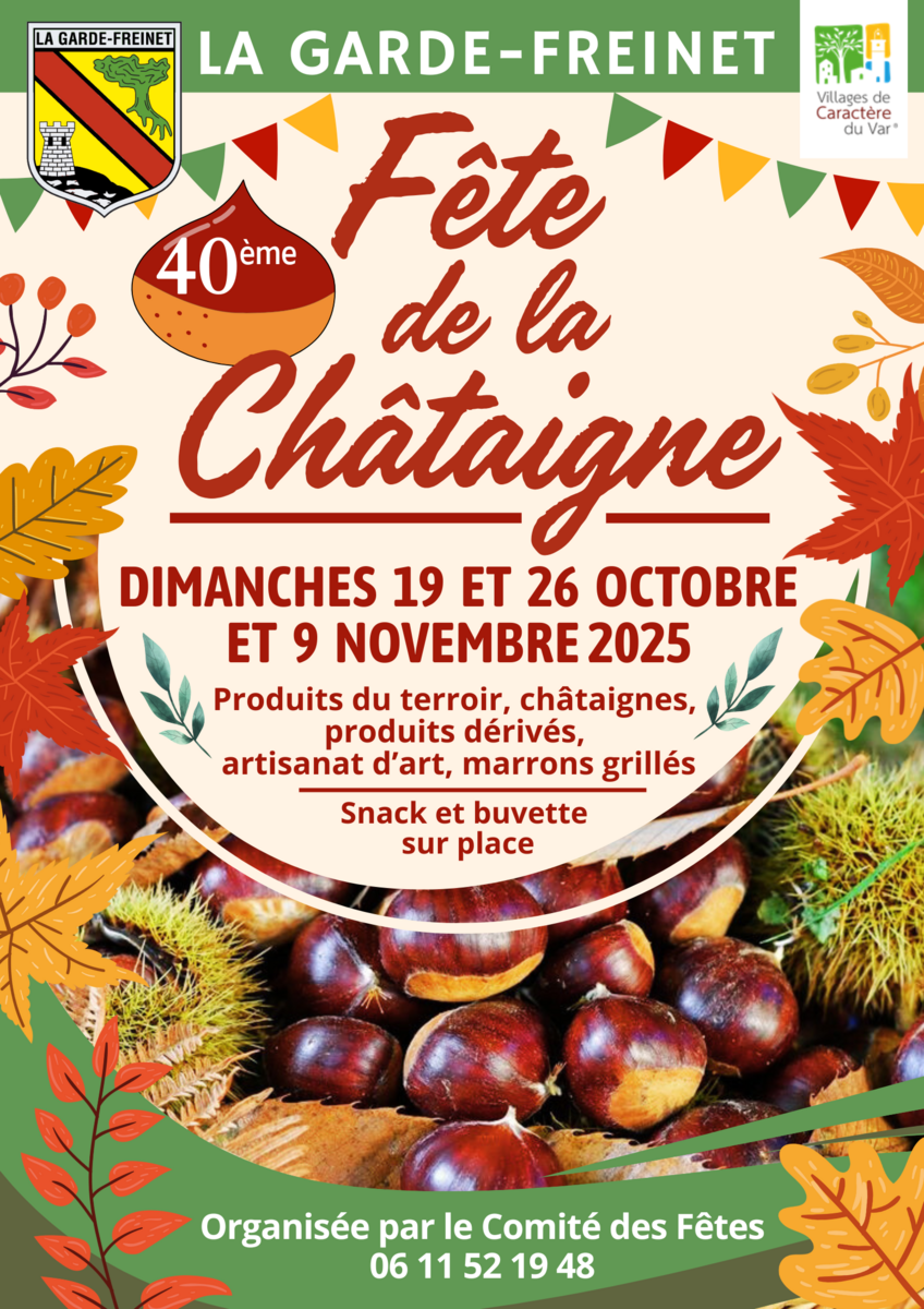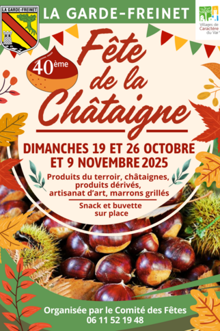 Dimanches 19, 26 octobre et le 9 novembre, marché traditionnelle de la châtaigne proposé par le Comité des Fêtes. Marché de châtaignes et produits dérivés, produits du terroir, marrons grillés, animations.