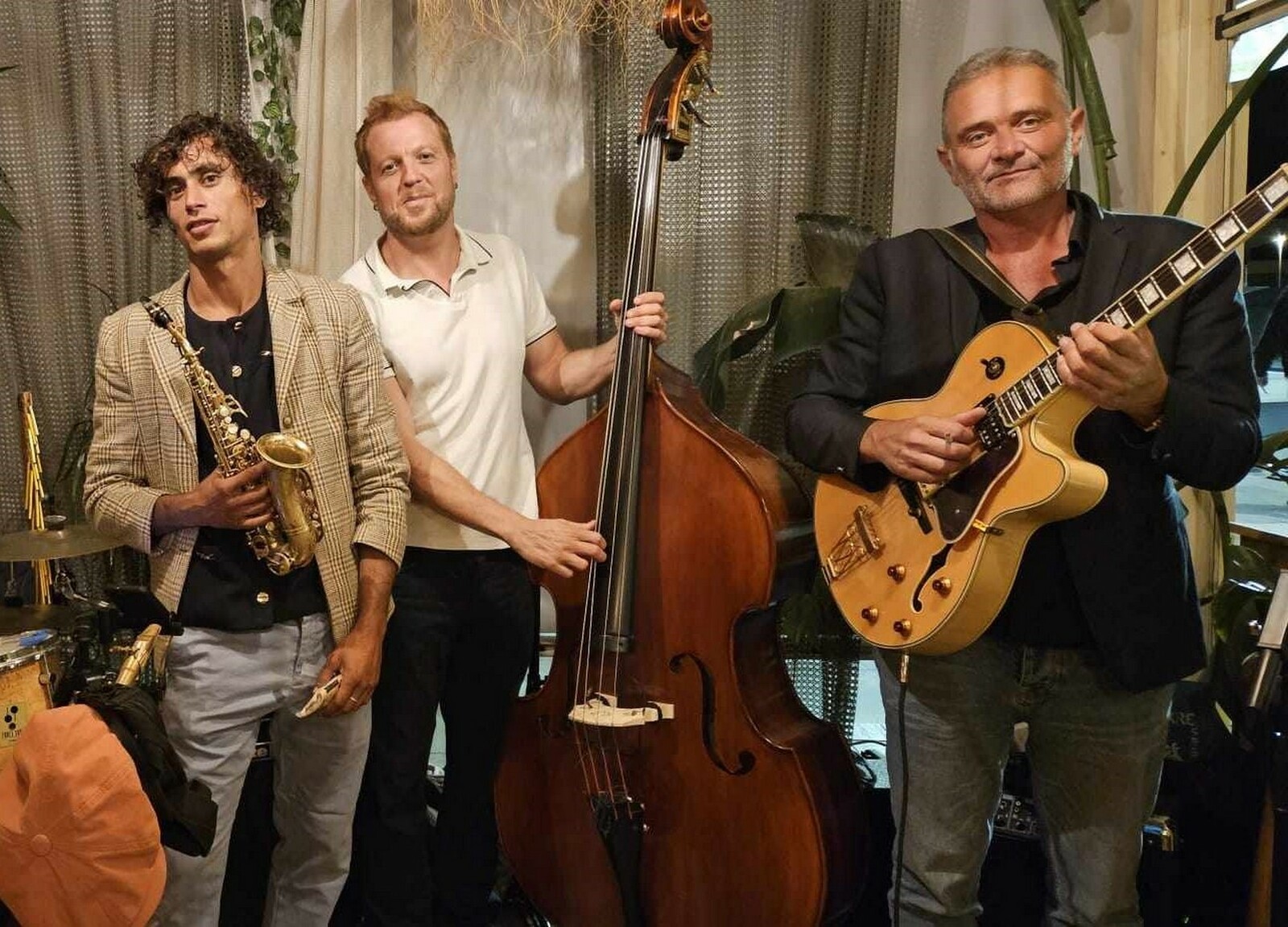Jazz manouche et autres. Benoît Francisot saxophoniste, Laurent Vayssiere guitariste, chanteur, Georgie Stankov contre bassiste, bassiste.