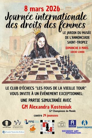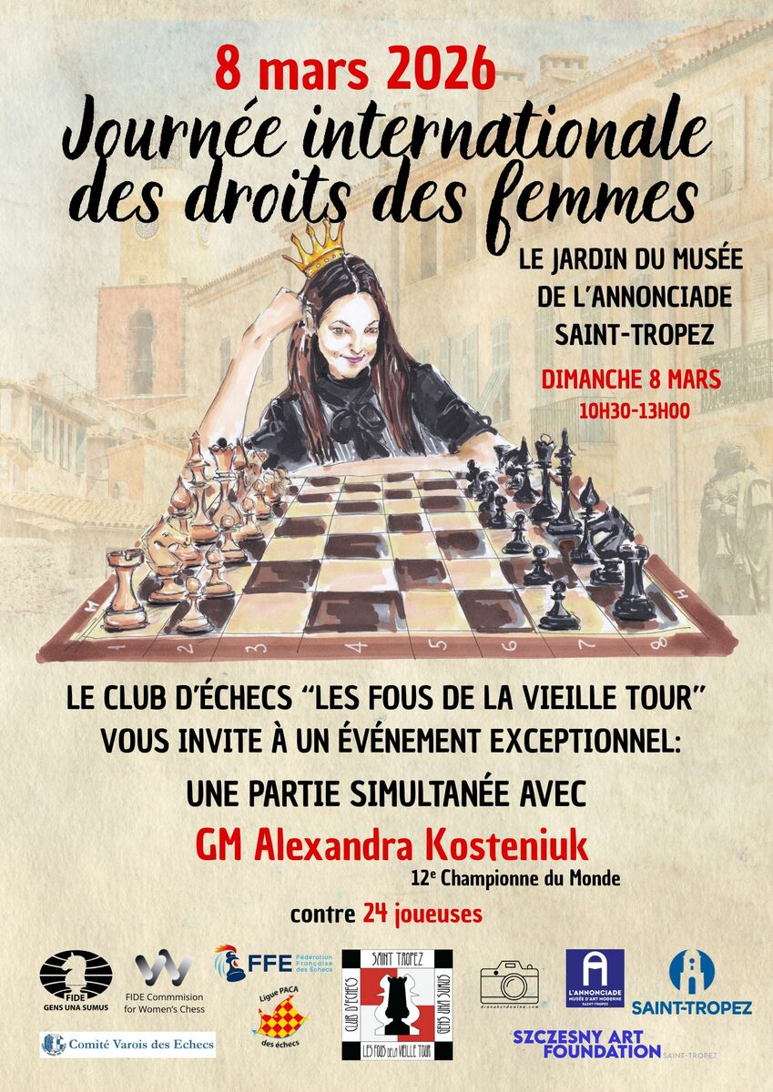 À l’occasion de la Journée Internationale des Femmes, une simultanée exceptionnelle sera organisée avec la participation de la 12e Championne du Monde GM Alexandra Kosteniuk. Elle affrontera des joueuses du club local d’échecs de Saint-Tropez ainsi que des joueuses de la région de la Côte d’Azur.Le 8 mars 2026, Saint-Tropez accueillera un événement unique en son genre. La simultanée se déroulera dans le cadre enchanteur du jardin du Musée de l’Annonciade, situé en plein cœur du port. (en cas d’intempéries, l’événement se tiendra dans la salle Louis Blanc).