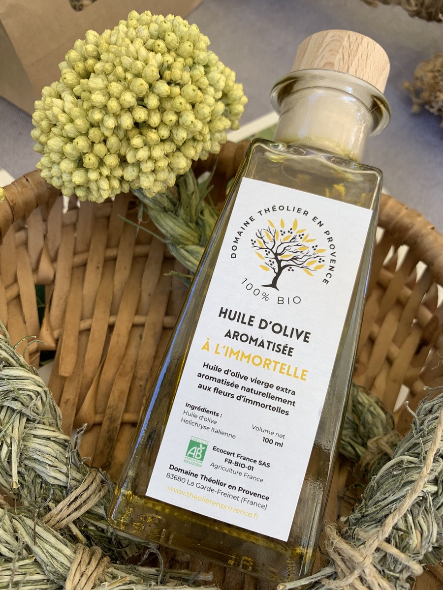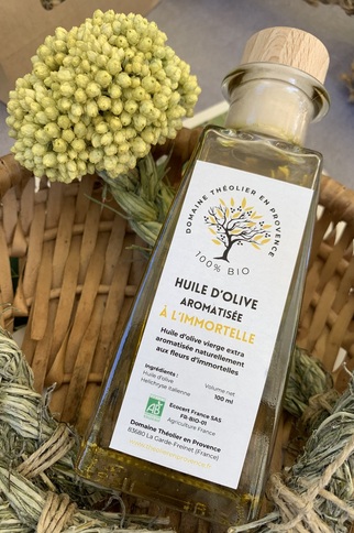 Huile d'olive vierge extra Bio (8€ et 20€) ou aromatisée à l'immortelle (10€)