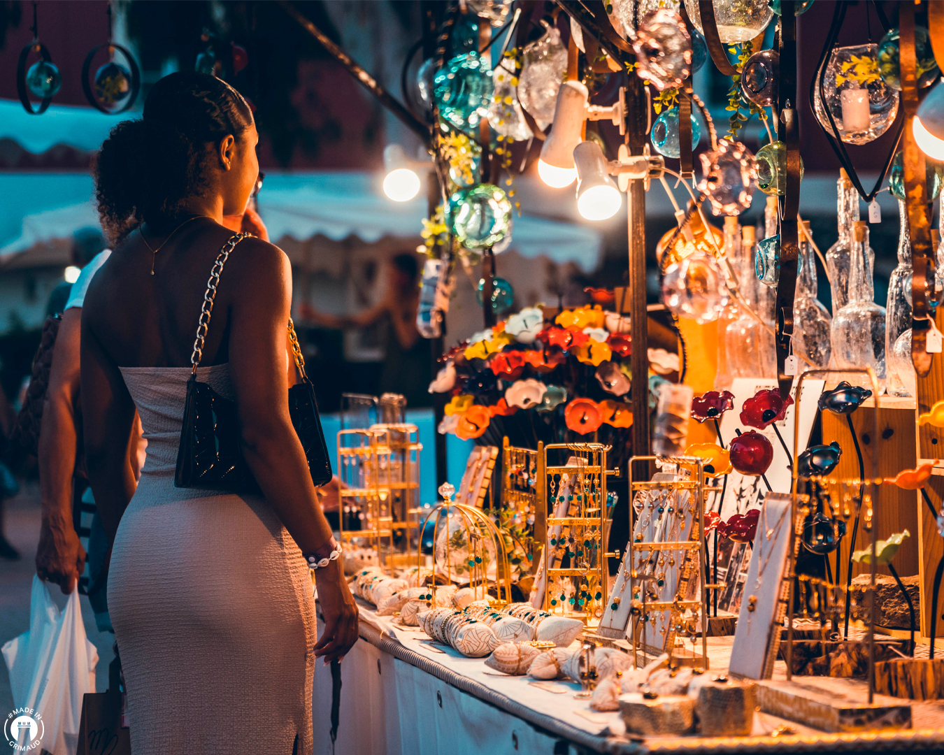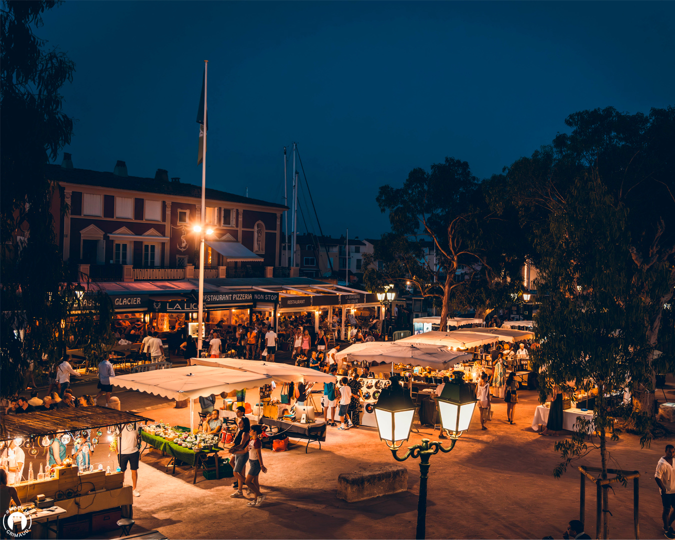Marché artisanal nocturne au cœur de la cité lacustre de Port Grimaud.