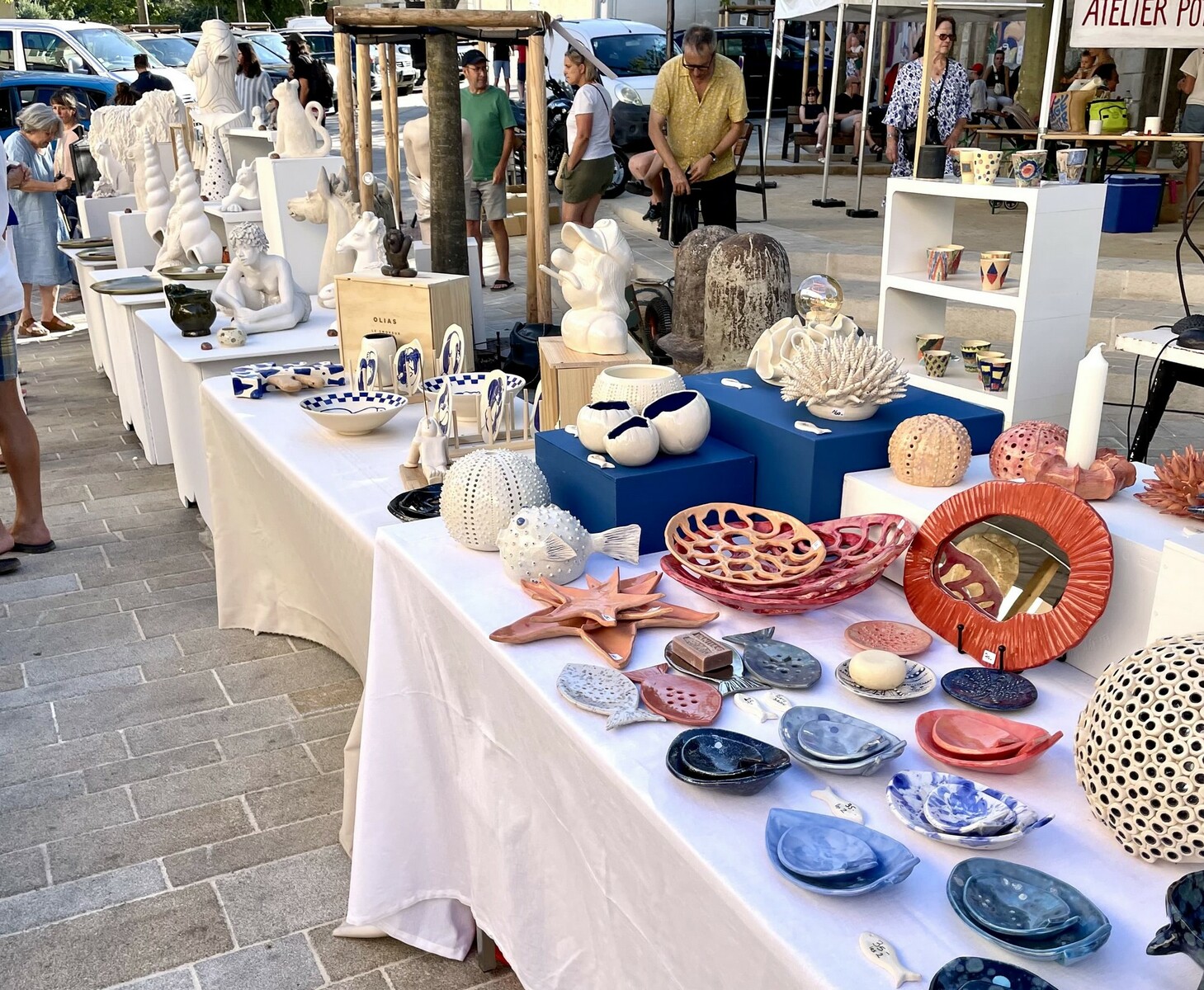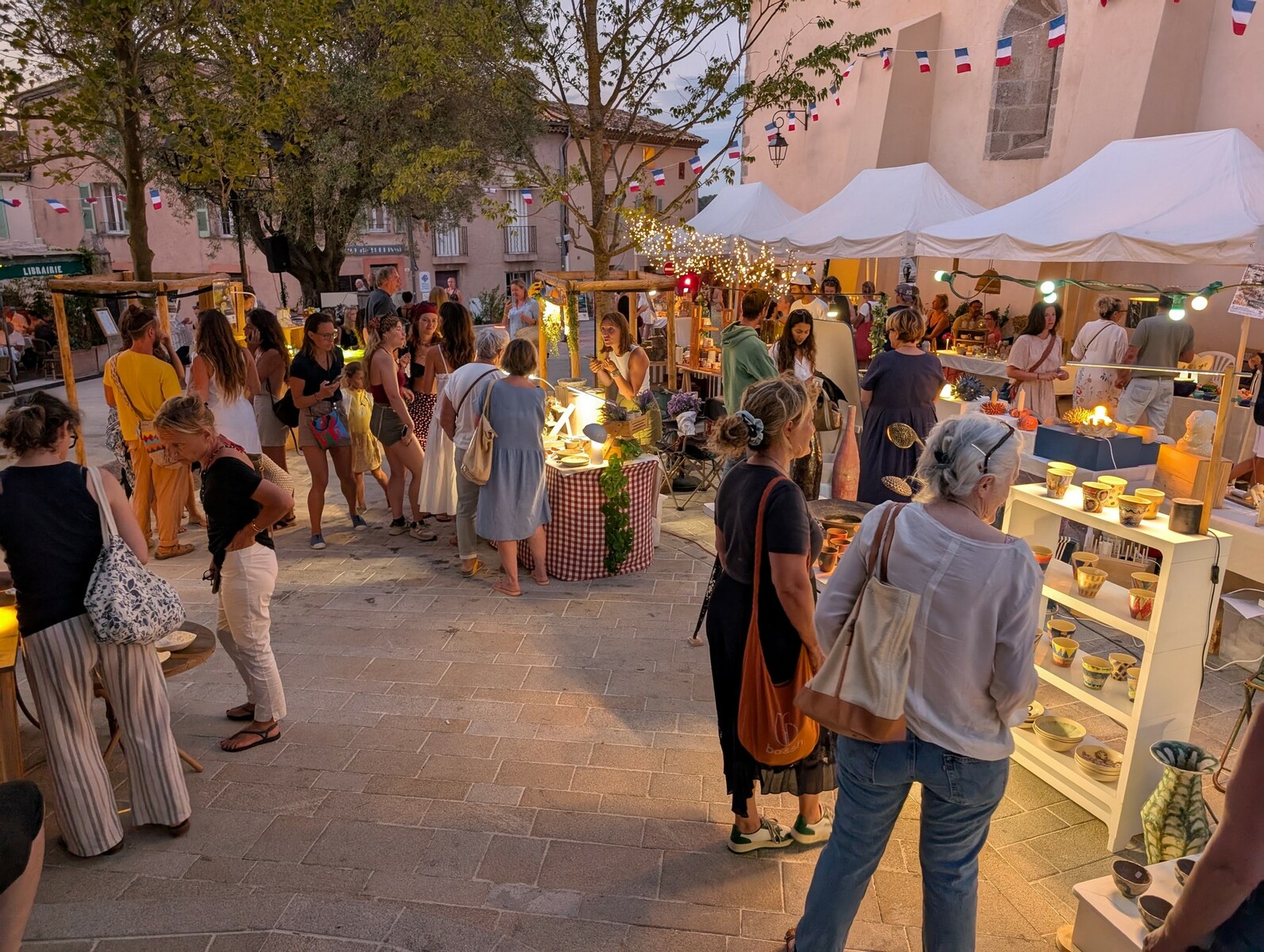 Une soirée estivale conviviale au cœur du village de Ramatuelle, célébrant l’artisanat et la céramique.