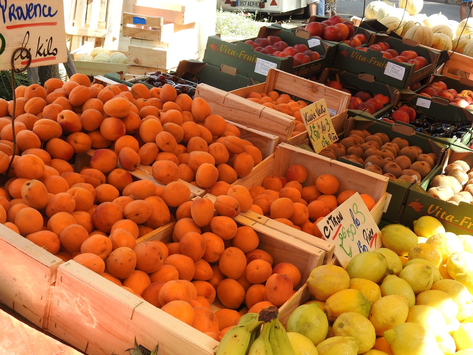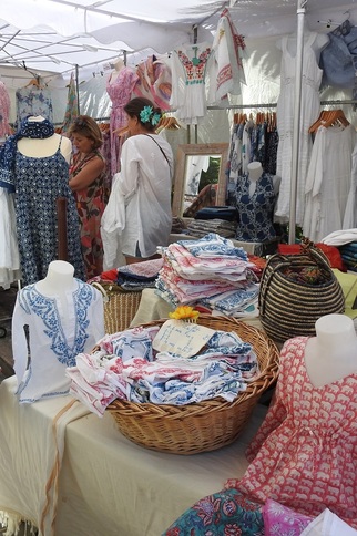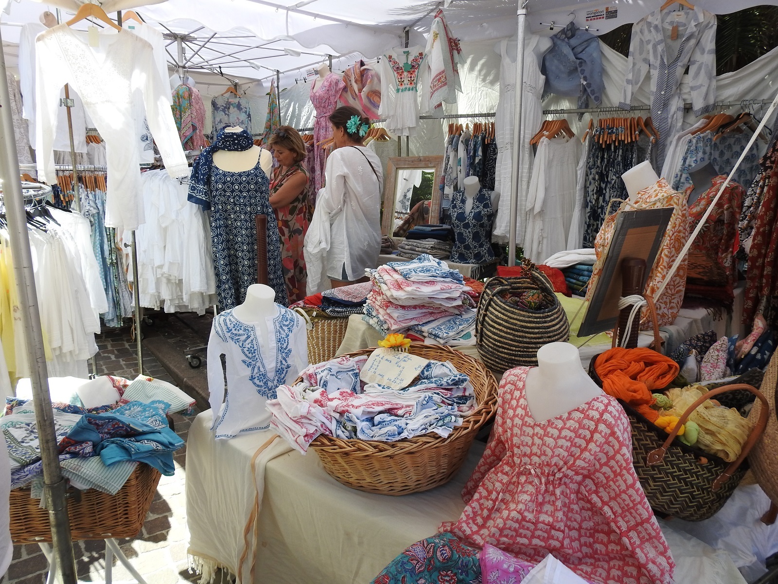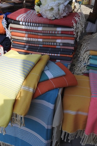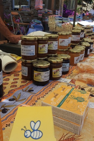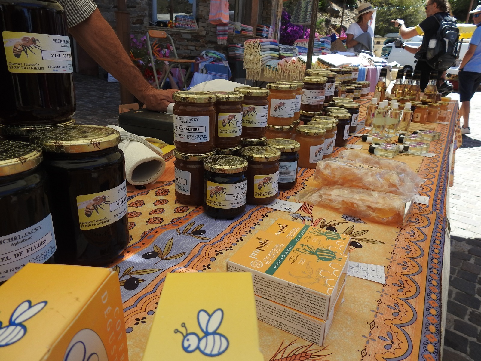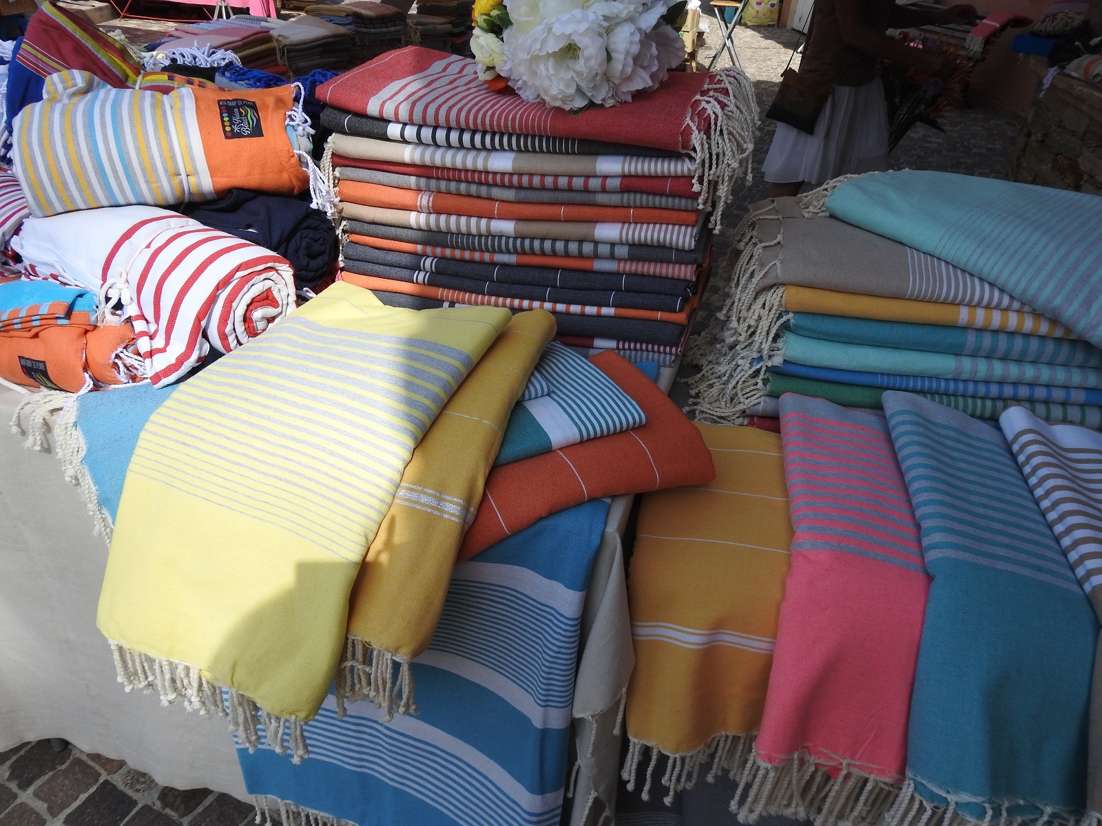 Un petit marché provençal au cœur du village, ambiance locale, avec vente de fruits et légumes, fromages, poissons, miel, huile d'olive, des nappes, des foutas, quelques vêtements ...