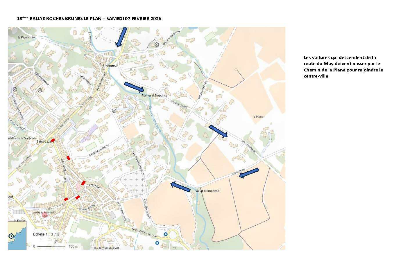 • Arrivée des voitures par la route du Muy : pour rejoindre le centre-ville, passage conseillé par le chemin de la Plane.