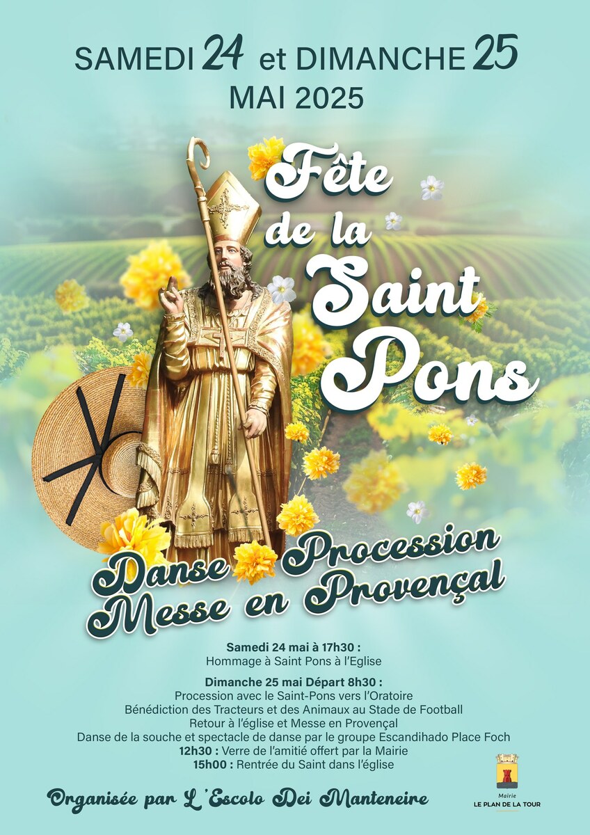 Saint-Pons, Saint patron du village, est mis à l’honneur lors d’une procession, de la messe chantée en provençal, et de la traditionnelle bénédiction des tracteurs, du matériel agricole et des animaux. Chants et danses provençales ponctuent la matinée.