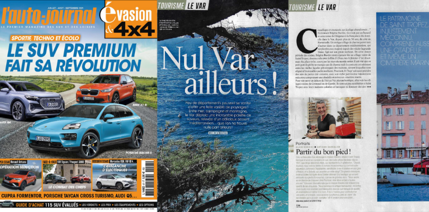 En partenariat avec Var Tourisme, le journaliste Thomas Riaud propose à ses lecteurs, fans de SUV, un beau reportage de 8 pages sur le Var. Le Golfe de Saint-Tropez y figure naturellement en très bonne place, avec notamment l'Atelier de sandales tropézien Rondini, le Domaine du Rayol, le restaurant Maurin des Maures et le Musée de la gendarmerie et du cinéma. Les villages de Grimaud et Gassin y sont également plébicités pour leur authenticité.