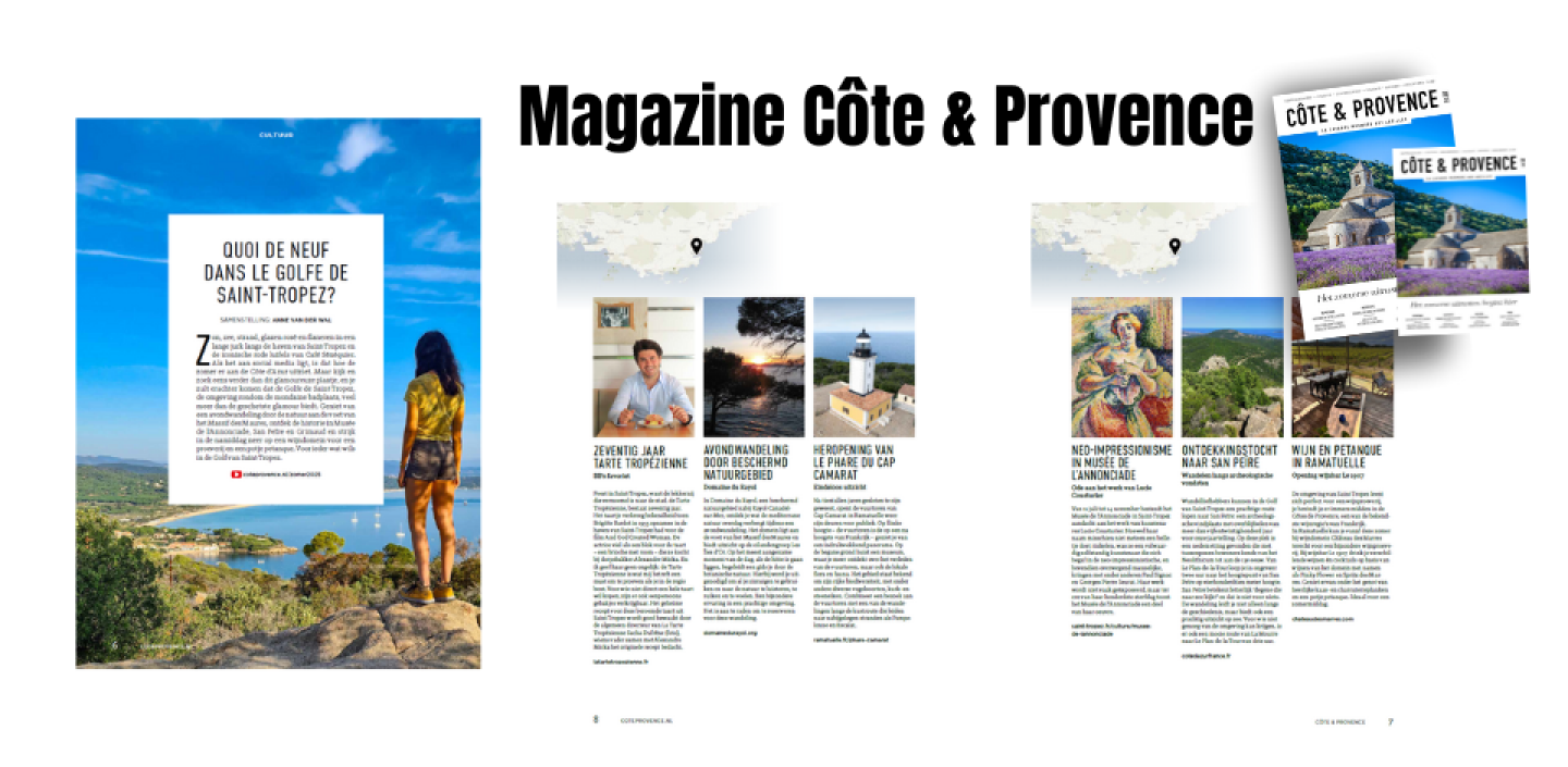 La rédactrice en chef et journaliste Suzanne Rietmeijer, qui connaît bien le territoire pour avoir été accueillie par le Service Promotion de la Communauté de communes lors d'un voyage de presse en 2024, organisé en partenariat avec Var Tourisme, a déjà publié plusieurs articles sur la destination. Le dernier en date est un magnifique article de 4 pages intitulé "Quoi de neuf dans le golfe de Saint-Tropez". Ce reportage valorise une sélection de nouveautés culturelles et de loisirs, parmi lesquelles :