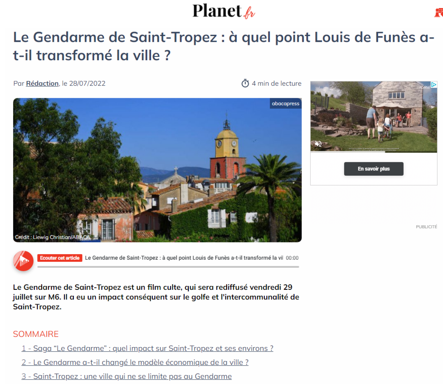 Le média https://www.planet.fr/ un site web à destination des seniors/retraités (55 à 70 ans environ) et dont certains articles cumulent 100 000 vues a souhaité mettre en lumière les impacts culturels et économiques de la célèbre saga des gendarmes à Saint-Tropez sur le territoire.