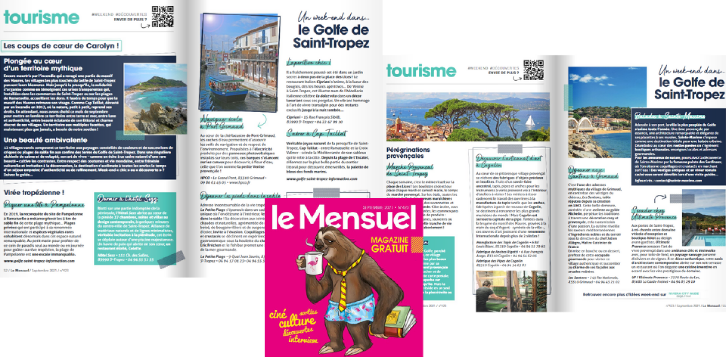 Créé en 2009, le Mensuel est un magazine culturel gratuit qui fait la part belle aux idées de sorties (cinéma, spectacles, concerts, théâtre). Un volet Tourisme de 4 pages est consacré à une destination coup de coeur et c'est le Golfe de Saint-Tropez qui a été choisi pour l'édition de septembre 2021. Golfe de Saint-Tropez Tourisme a bien sûr aidé et conseillé la journaliste Carolyn Bouchard pour son article, tout en leur proposant un choix parmi nos plus beaux visuels.
