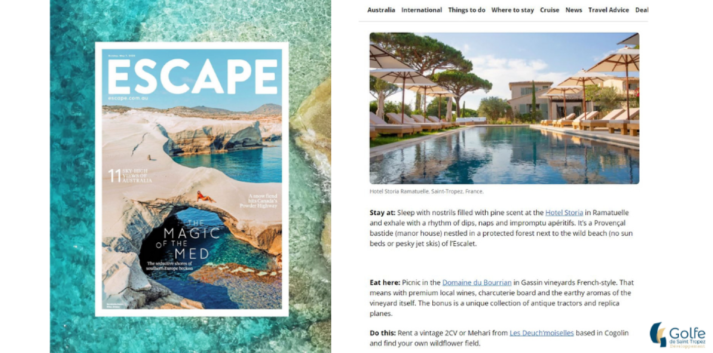 En partenariat avec Var Tourisme, Golfe de Saint-Tropez Développement avait suggéré des expériences insolites, ainsi que les nouveautés en matière d'hébergements à la journaliste Flip Byrnes pour le magazine australien "Escape".
