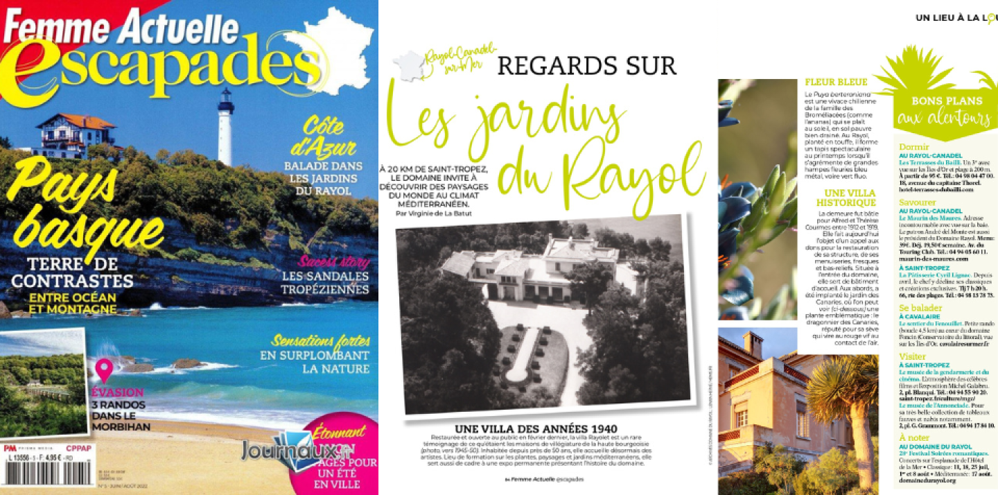 Cette "petite soeur" spécial voyage du célèbre mensuel "Femme Actuelle" a consacré un très bel article de 4 pages au Domaine du Rayol, le Jardin des Méditerranées. De magnifiques photos illustrent la beauté du lieu, et la rubrique "Bons plans aux alentours" permet d'organiser au mieux son futur séjour.