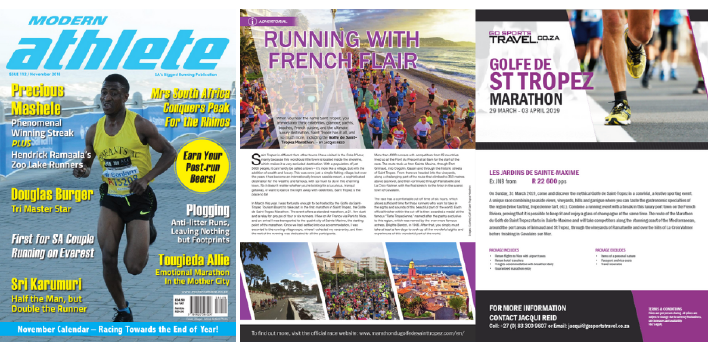 Pour l'édition du 31 mars 2019, Jacqueline Reid propose le marathon dans une offre packagée en ligne. Elle fait également la promotion du Marathon via les réseaux sociaux et un partenariat avec le Magazine Modern Athlete, le plus grand magazine de running sud-africain (78 682 lecteurs du magazine papier, 70 065 lecteurs du magazine en ligne). L'article sur le Marathon du Golfe de Saint-Tropez est paru en novembre 2018 et sera également relayé par newsletter à leurs 79 369 abonnés.