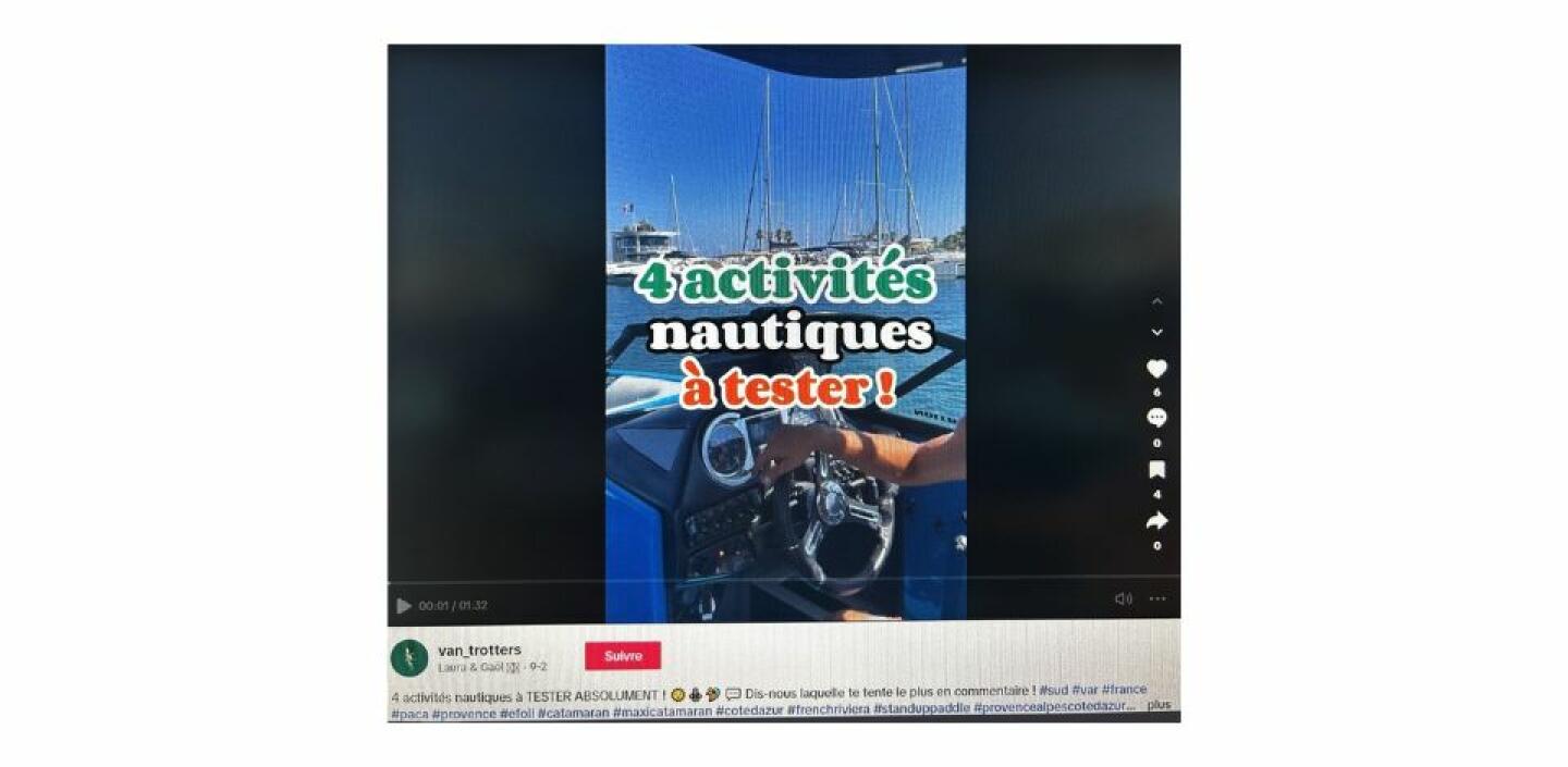 Les influenceurs Laura et Gaël, connus sous le nom de Van Trotters sur TikTok et Instagram, avec leurs 19,3K abonnés, ont récemment visité le golfe de Saint-Tropez lors d'un de nos accueil presse. Leur audience, composée principalement de jeunes et de millénials passionnés de vanlife, a pu suivre leur reportage sur la découverte du nautisme éco-responsable à Cavalaire.