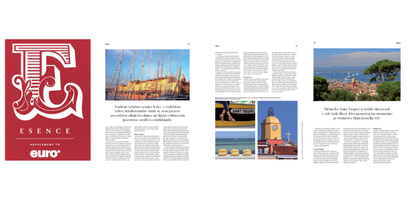 Stephanka écrit pour de nombreux magazines en République Tchèque. Après un 1er article dans le magazine en ligne «Pro ženy», nous avons le plaisir de découvrir le 2ème article de Stephanka. Paru dans le magazine tchèque haut de gamme «Esence», il propose un reportage de 8 pages avec un joli portrait de l'icône tropézienne Brigitte Bardot, ainsi que quelques incontournables à ne pas manquer : le Musée de la gendarmerie et du cinéma, le Club 55, la plage de Pampelonne, l'hôtel Byblos, les sandales Kjacques et la Tarte tropézienne (le dessert préféré de BB). Le magazine «Esence» est le supplément du magazine «Euro», très célèbre en République Tchèque, qui serait l'équivalent là-bas du «Financial Times».