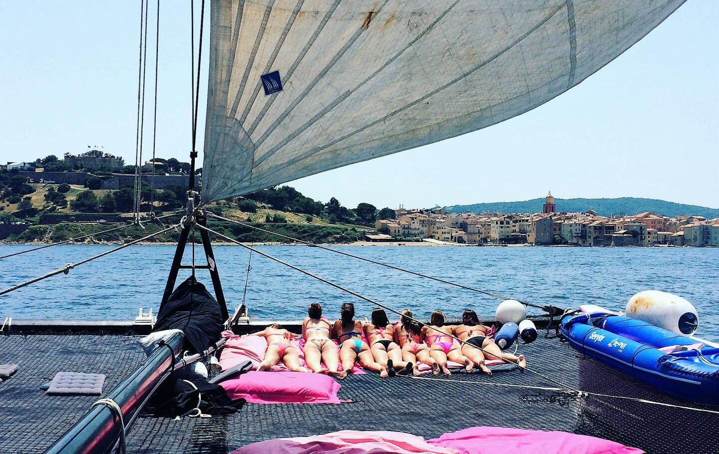 Coucher de soleil en catamaran pour un enterrement de vie de célibataire. Profitez de la balade pour vous détendre, boire l’apéritif et écouter de la musique. Des idées de défis et missions pour la future mariée seront possible avec la participation des autres passagers.