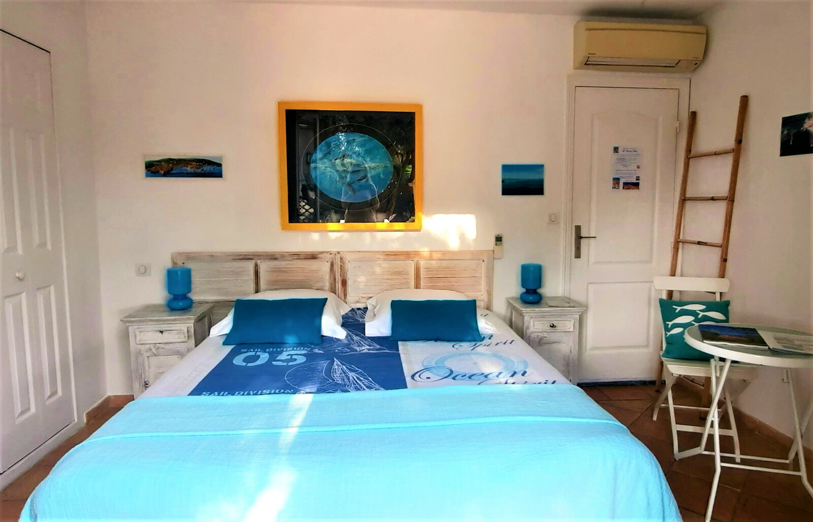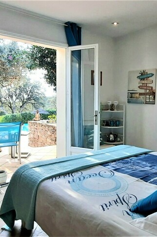 * Chambre DAUPHIN vue piscine tout confort : lit Queen Size, salle d’eau privative (douche), vue piscine, clim réversible, TV, plateau thé/café/tisane, Mini-frigo.Proche des villages du Golfe de St-Tropez, à 10 min des plages, 3 chambres d’hôtes raffinées, dont 1 suite familiale, idéal pour se ressourcer !