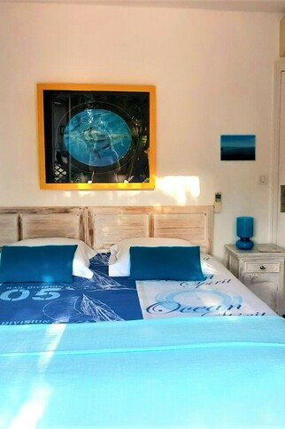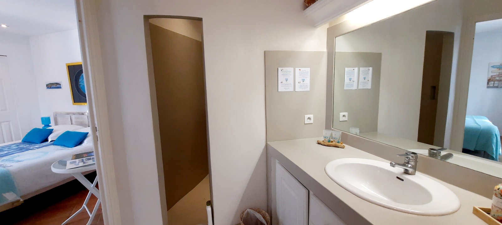 * Chambre BALEINE vue piscine tout confort : lit King Size, salle d’eau privative (douche), clim réversible, TV, plateau thé/café/tisane.