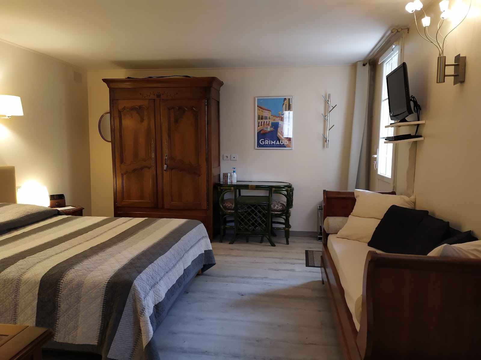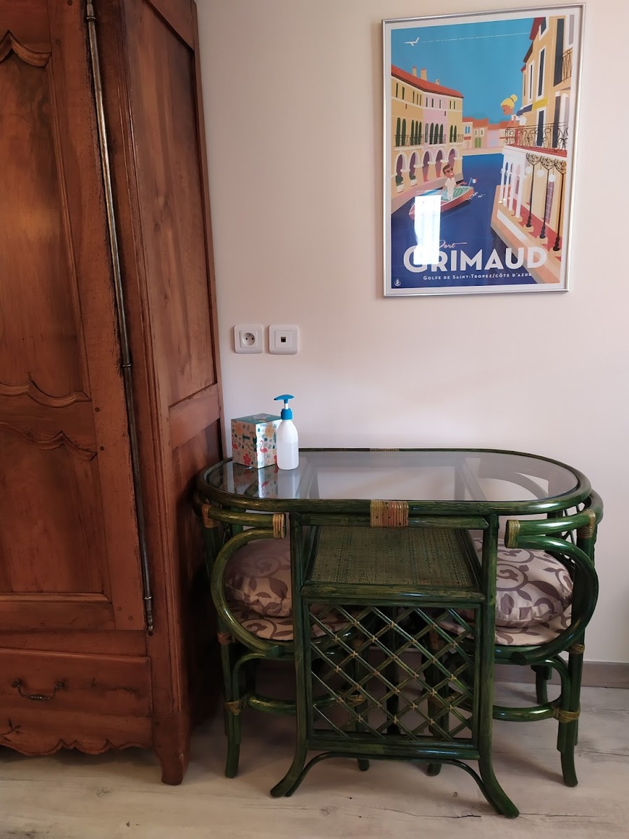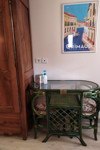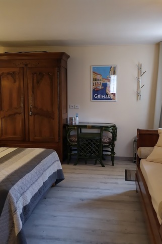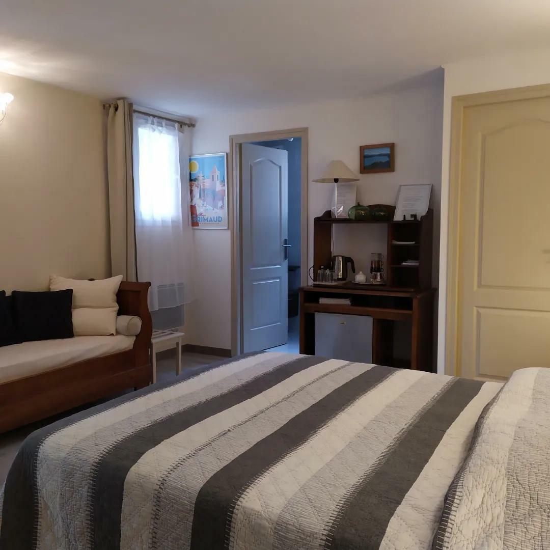 Une jolie chambre d'hôtes indépendante, au calme, dans le massif des Maures, située à 6 km du village de Grimaud, 11 km de Port Grimaud et 18 km de Saint-Tropez. La chambre fonctionnelle est équipée d'un grand lit en 160 x 200 et d'une petite banquette pour vous relaxer. Télévision, petit réfrigérateur et bouilloire sont à disposition. La chambre dispose d'une salle de bain privée avec douche XXL et fenêtre, les WC sont indépendants.