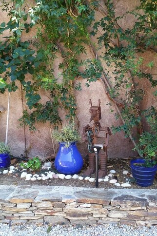 La chambre a un accès direct sur une grande terrasse privative contigue à la petite piscine de la maison. La terrasse dispose d'un espace repas où les petits déjeuners vous seront servis lors de la période estivale et d'un espace détente avec transats. La maison est équipée d'une prise de recharge lente pour véhicules électriques (avec supplément).
