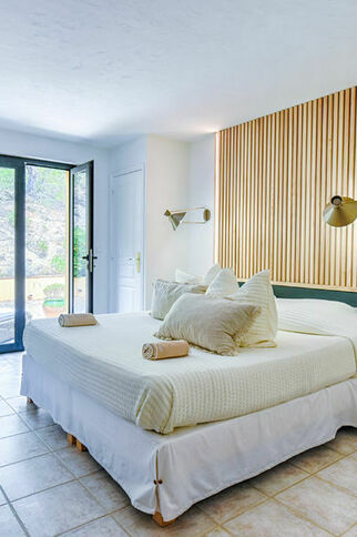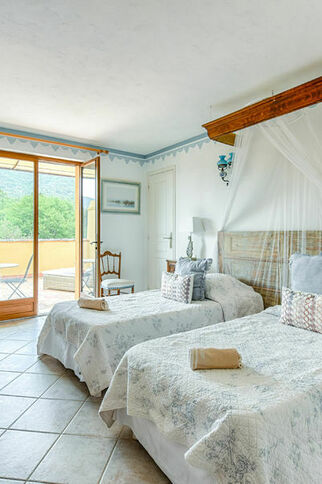 La maison propose trois chambres climatisées au premier étage, décorées dans un style provençal raffiné, alliant authenticité et confort moderne. Une chambre familiale, idéale pour un couple avec deux enfants, est située en rez-de-jardin. Deux appartements indépendants, pensés pour deux personnes, complètent l’offre et séduisent par leur atmosphère intime et chaleureuse.