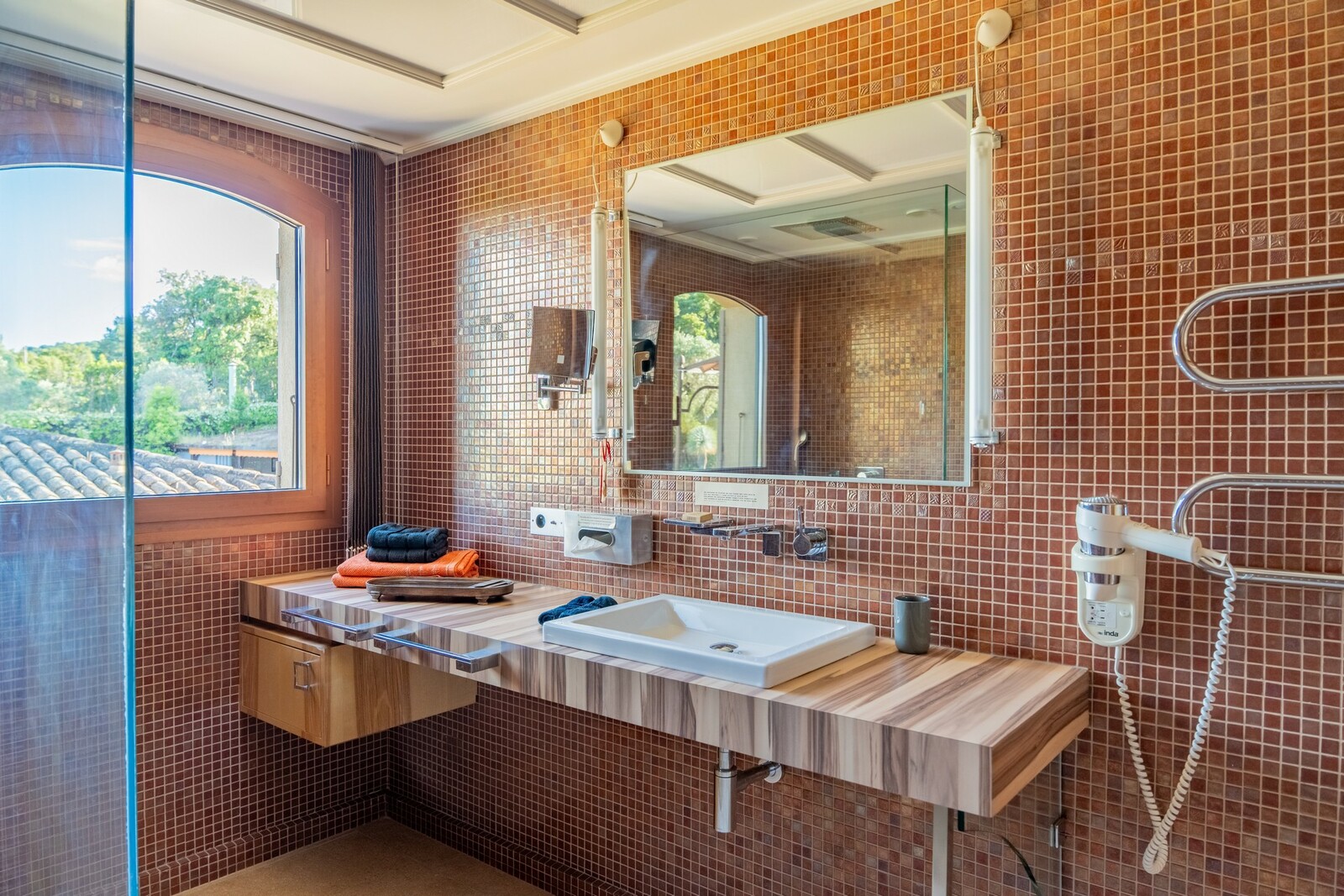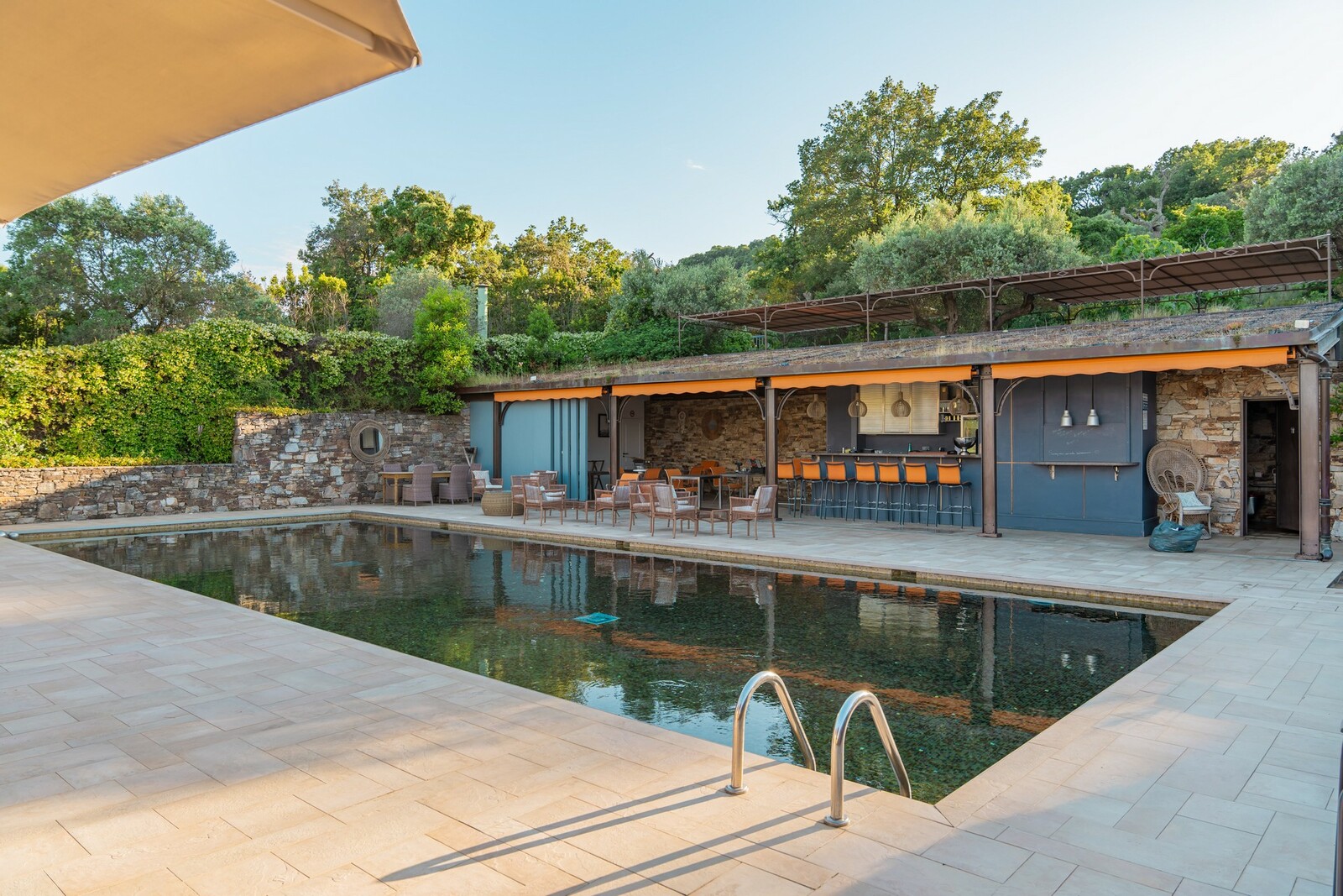 Nichée au cœur d'une plantation typiquement méditerranéenne, la piscine en mosaïque (16 x 6m - chauffée à 28°C) et son solarium vous invitent à la détente.