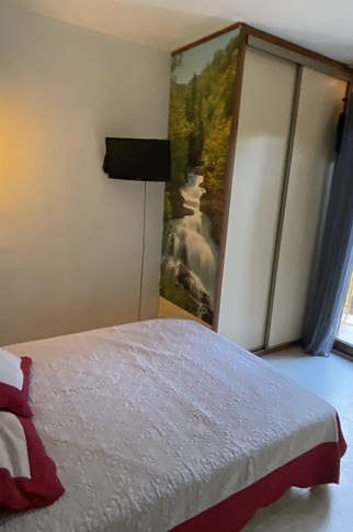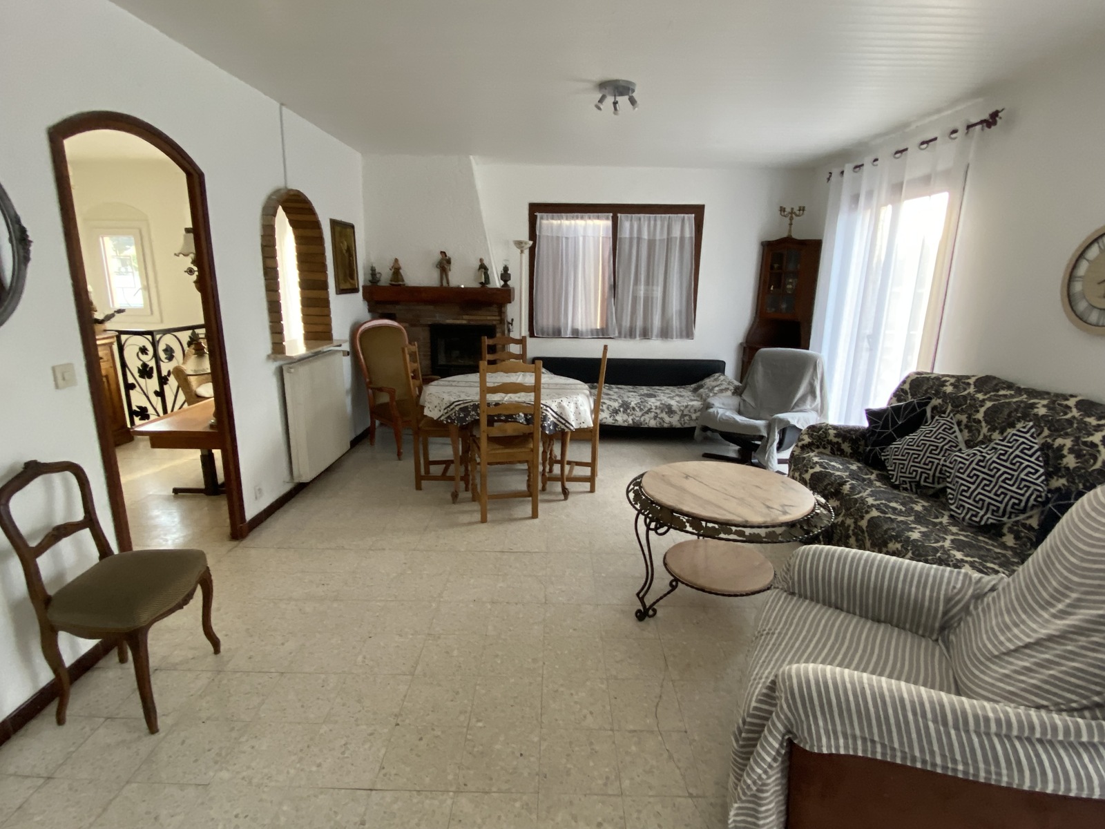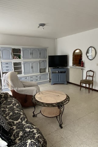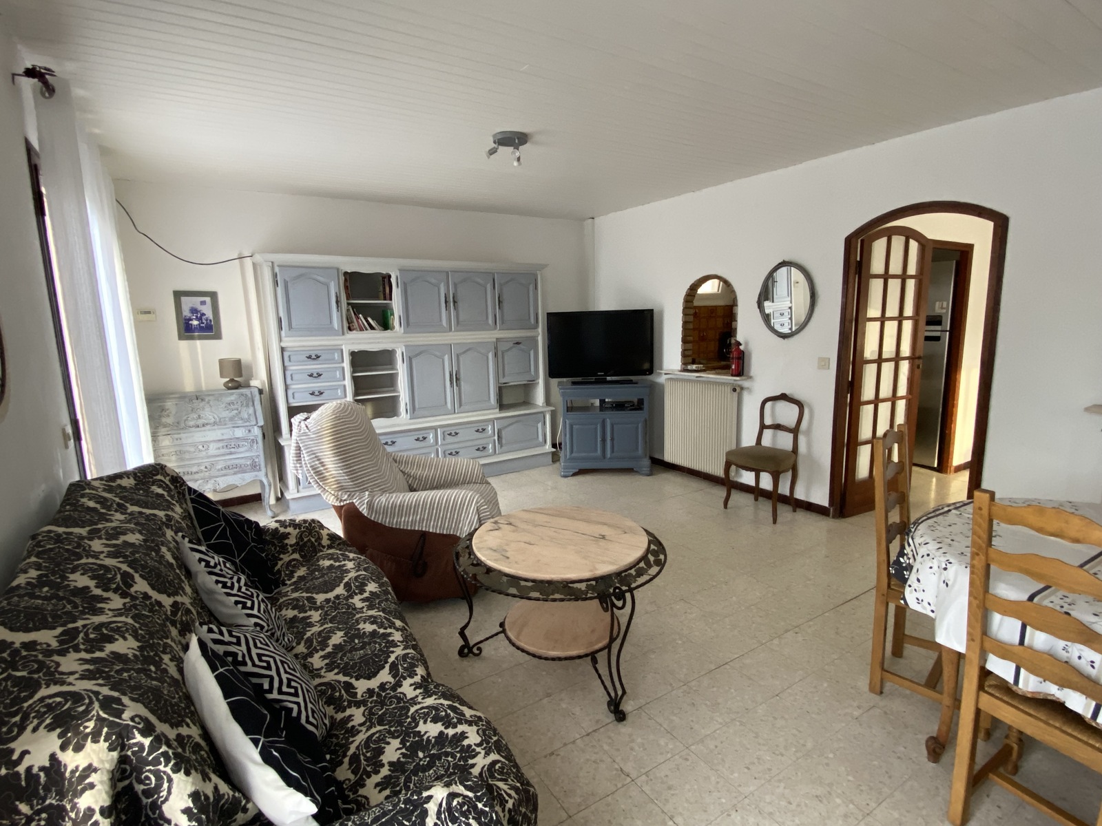 Un grand salon - salle à manger contenant un canapé convertible (2 personnes maximum), 2 fauteuils, une table basse, une TV grand écran plat, un grand buffet et un secrétaire.