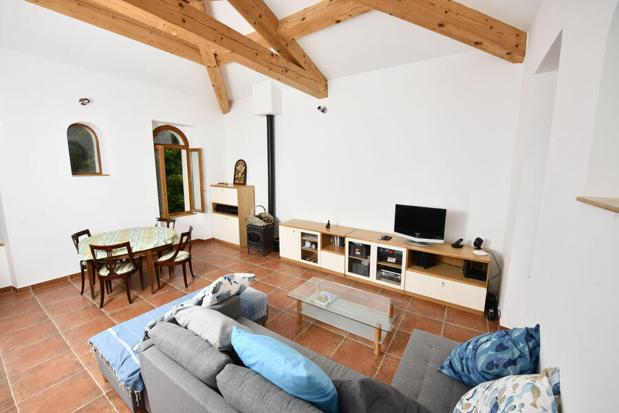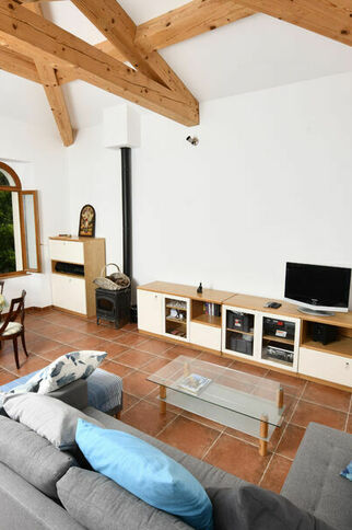 Le haut du moulin dispose d'un grand salon et quatre grandes fenêtres donnant sur le nord côté jardin et sur le sud coté piscine. Il présente un plafond élevé aux poutres apparentes et est équipé d’un poêle à bois, d’un espace bar, d'une télévision et de la wifi. Il donne sur une grande terrasse faisant face au cabanon, avec une table, en grès coquillé, pouvant recevoir 8 à 10 personnes, et avec une superbe vue de 360° sur la propriété.