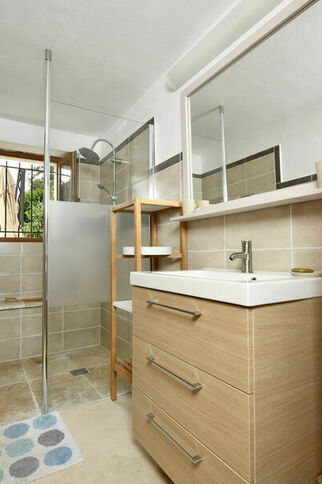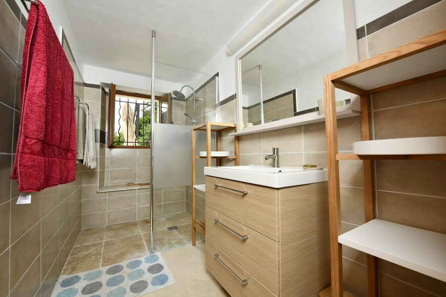 Le cabanon comprend 2 chambres, chacune avec sa climatisation et petite salle de bain attenante avec douche et WC, une cuisine entièrement équipée donnant sur une grande terrasse en partie couverte avec cuisine d’été.