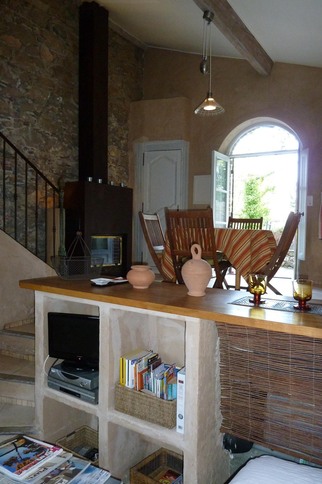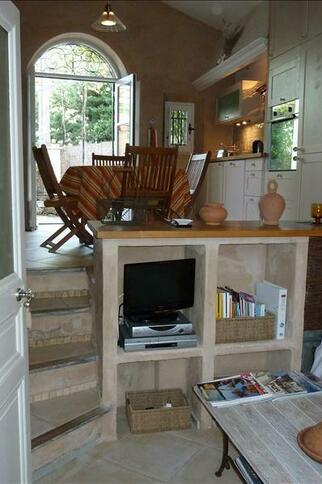 La cuisine américaine est ouverte sur la salle à manger et la terrasse/jardin.