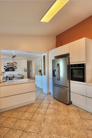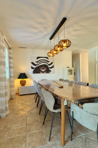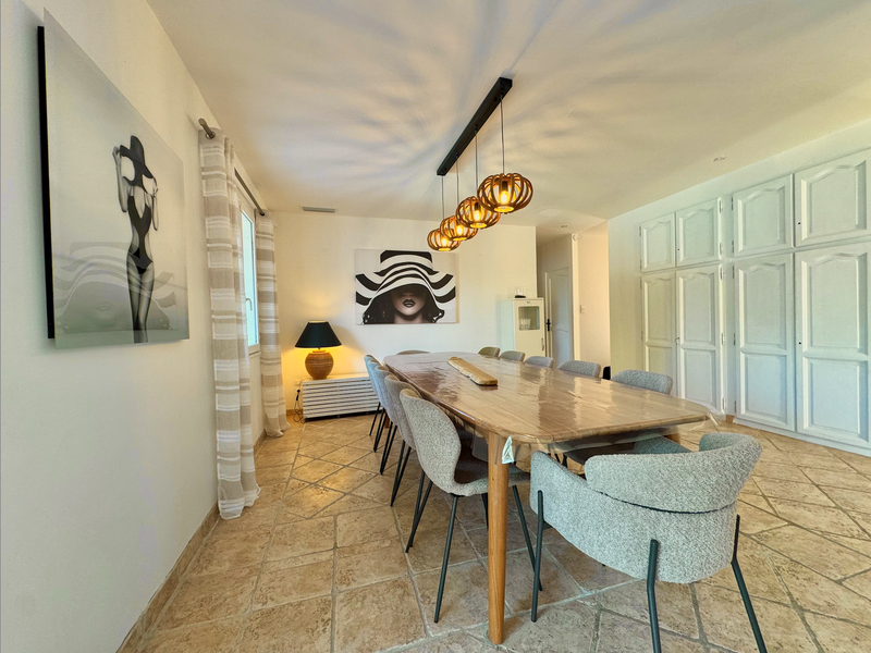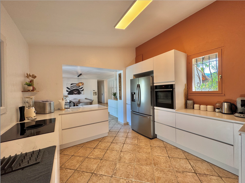 De plain-pied et entièrement climatisée, la villa est composée : • Espace de vie spacieux et lumineux : une cuisine ouverte entièrement équipée (réfrigérateur américain, four, micro-ondes, lave-vaisselle, machine à glaçons, etc.), un cellier (lave-linge et réfrigérateur/congélateur), salle à manger et salon. • 5 chambres, 1 bureau et 3 salles de bain :