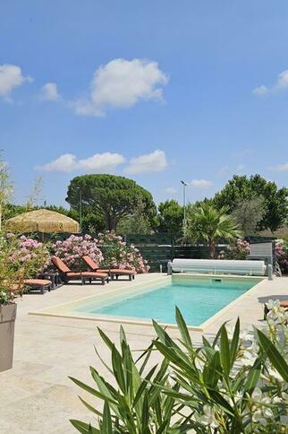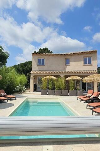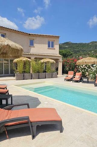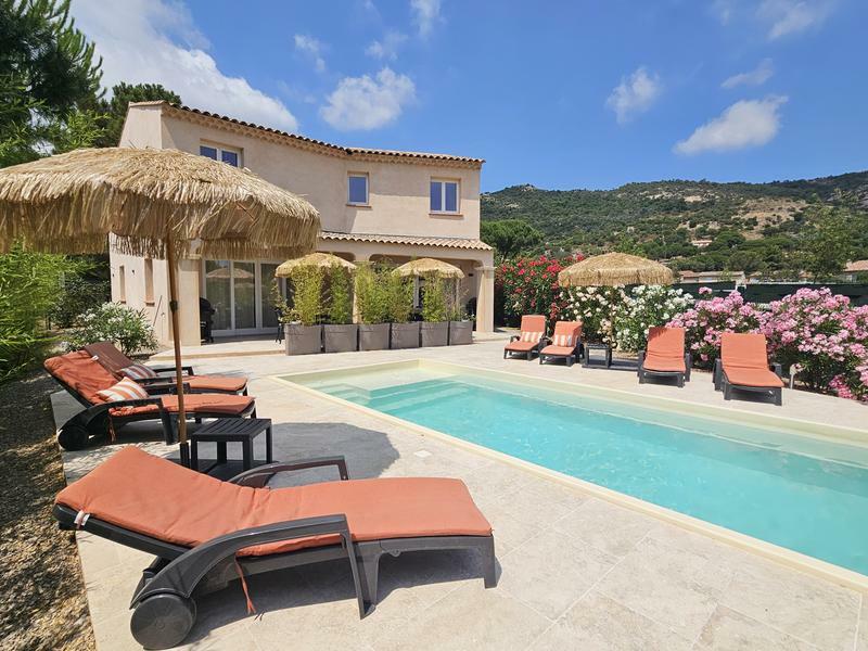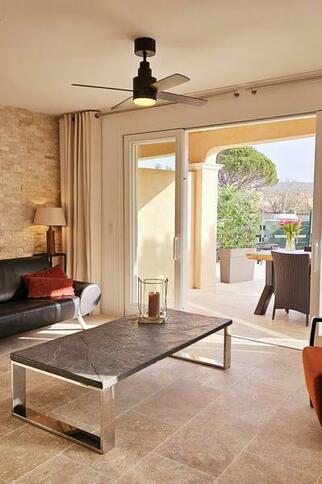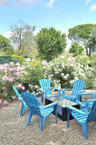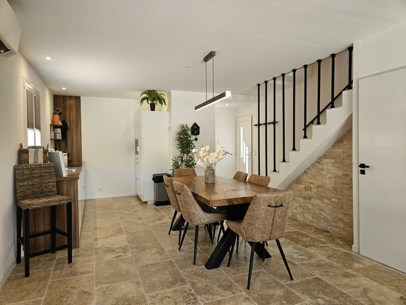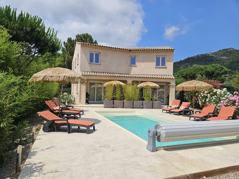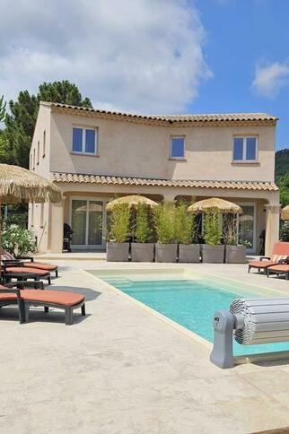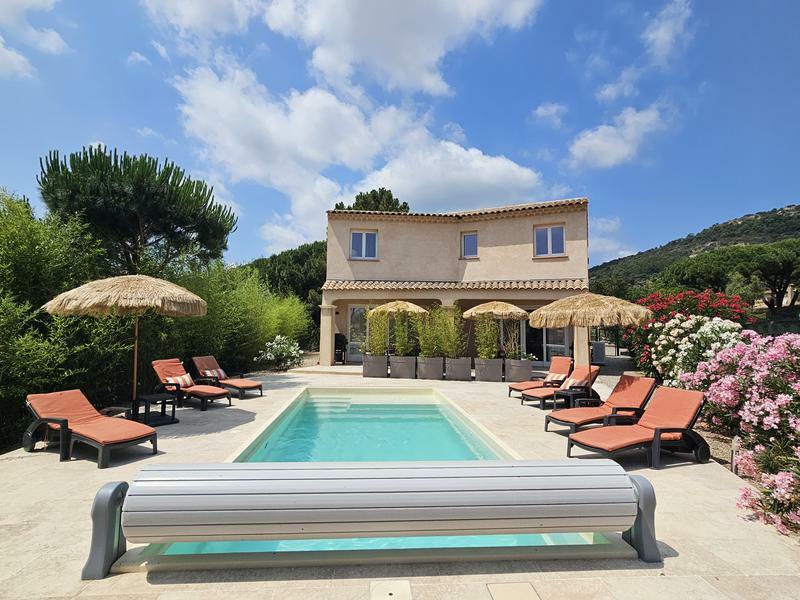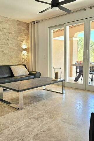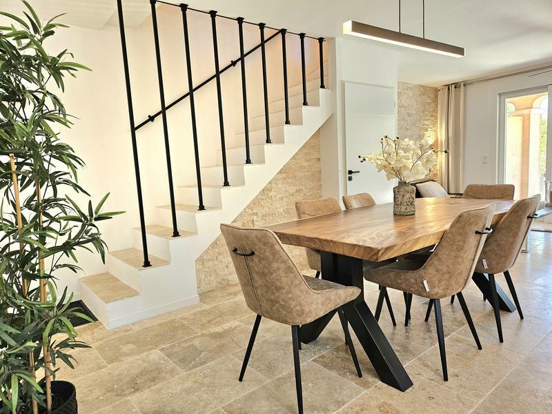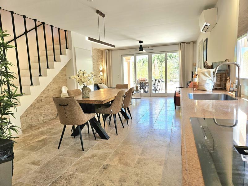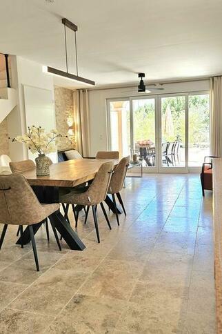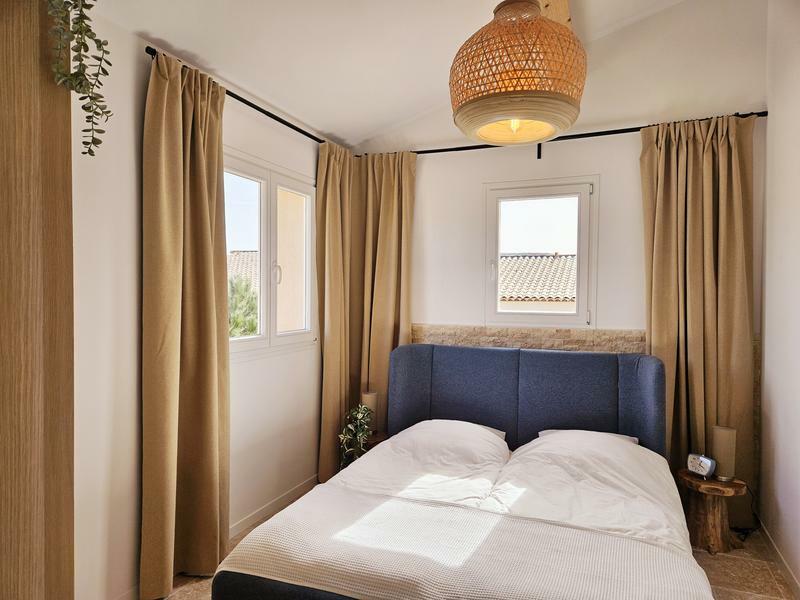 Bambou dispose de trois chambres, deux salles de bain et un WC séparé à l’étage. La cuisine ouverte moderne, entièrement équipée, ainsi que le séjour chaleureux se trouvent au rez-de-chaussée, d’où l’on accède, par les portes donnant sur la terrasse, au patio avec vue directe sur la piscine. (Bambou et Laurier Rose partagent la piscine.)