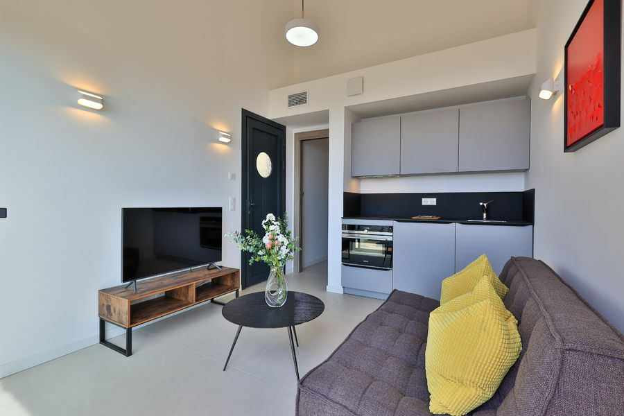 Au premier étage d'une villa, baigné de lumière et tourné vers la mer, cet appartement au style contemporain dispose d’une cuisine équipée avec espace salon et d’une terrasse privative. Accès uniquement par des escaliers.