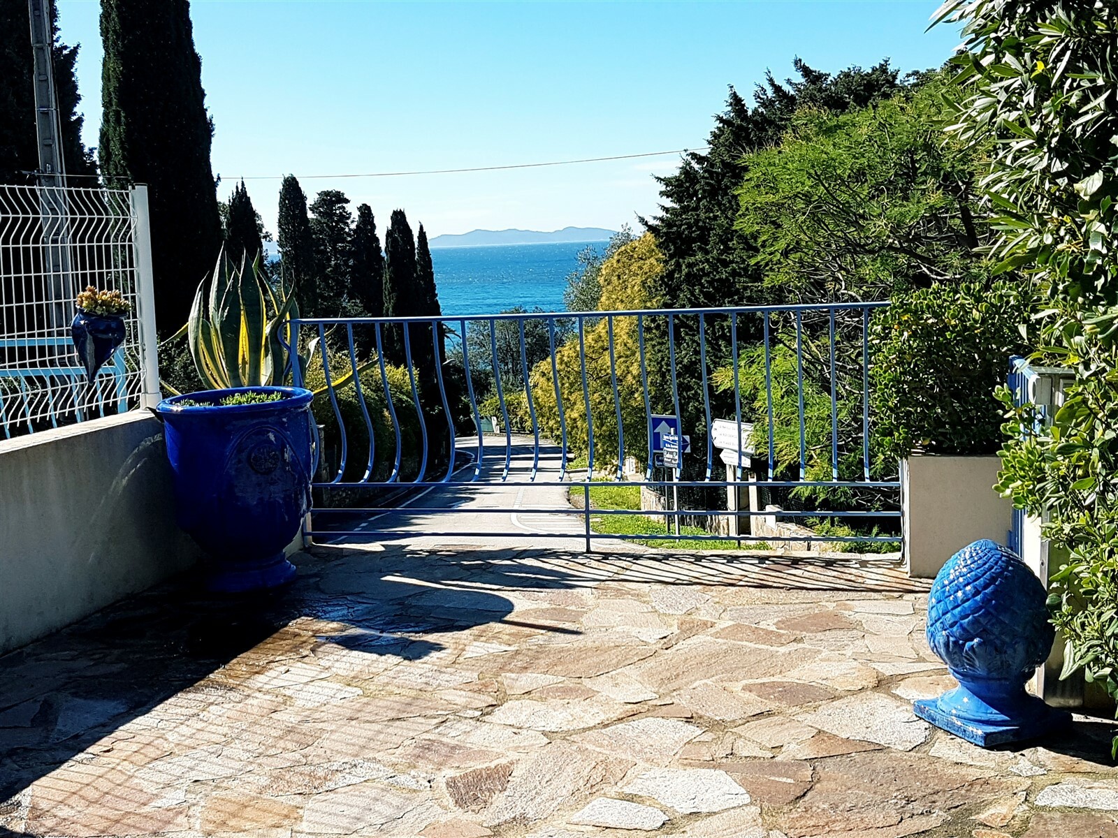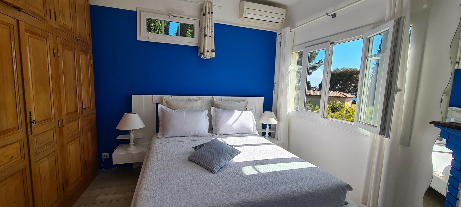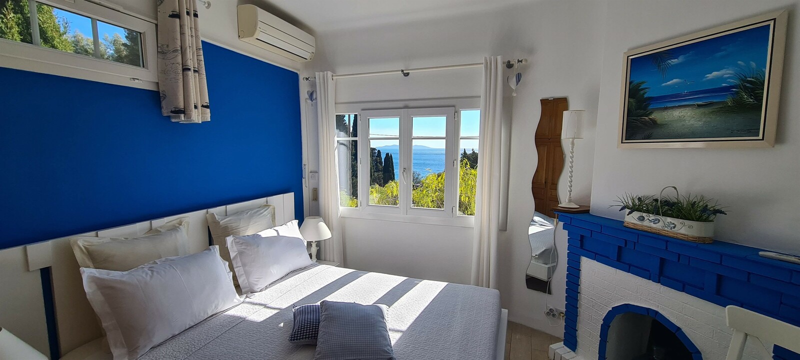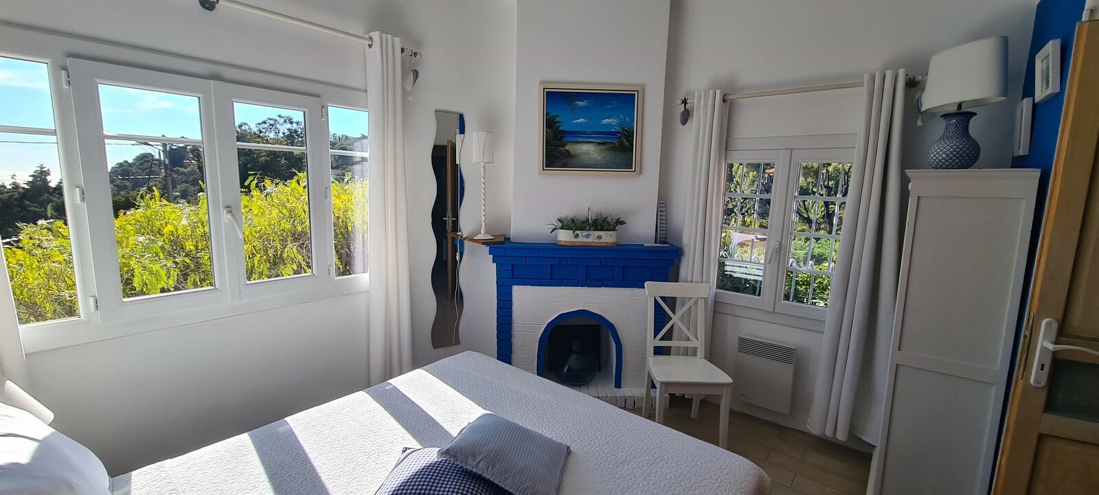 Villa avec une vue mer exceptionnelle de 60 m2 pour 4 à 6 personnes décorée aux couleurs de la mer. Entièrement clôturée avec petit jardin ombragé. Garage fermé.