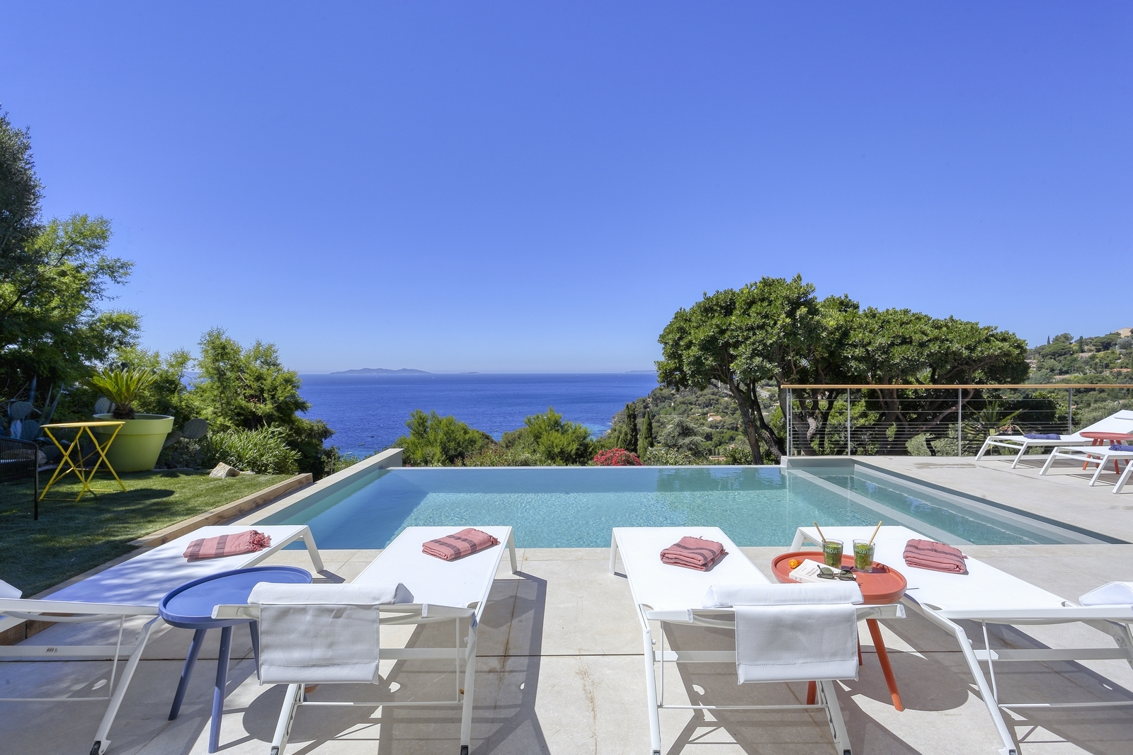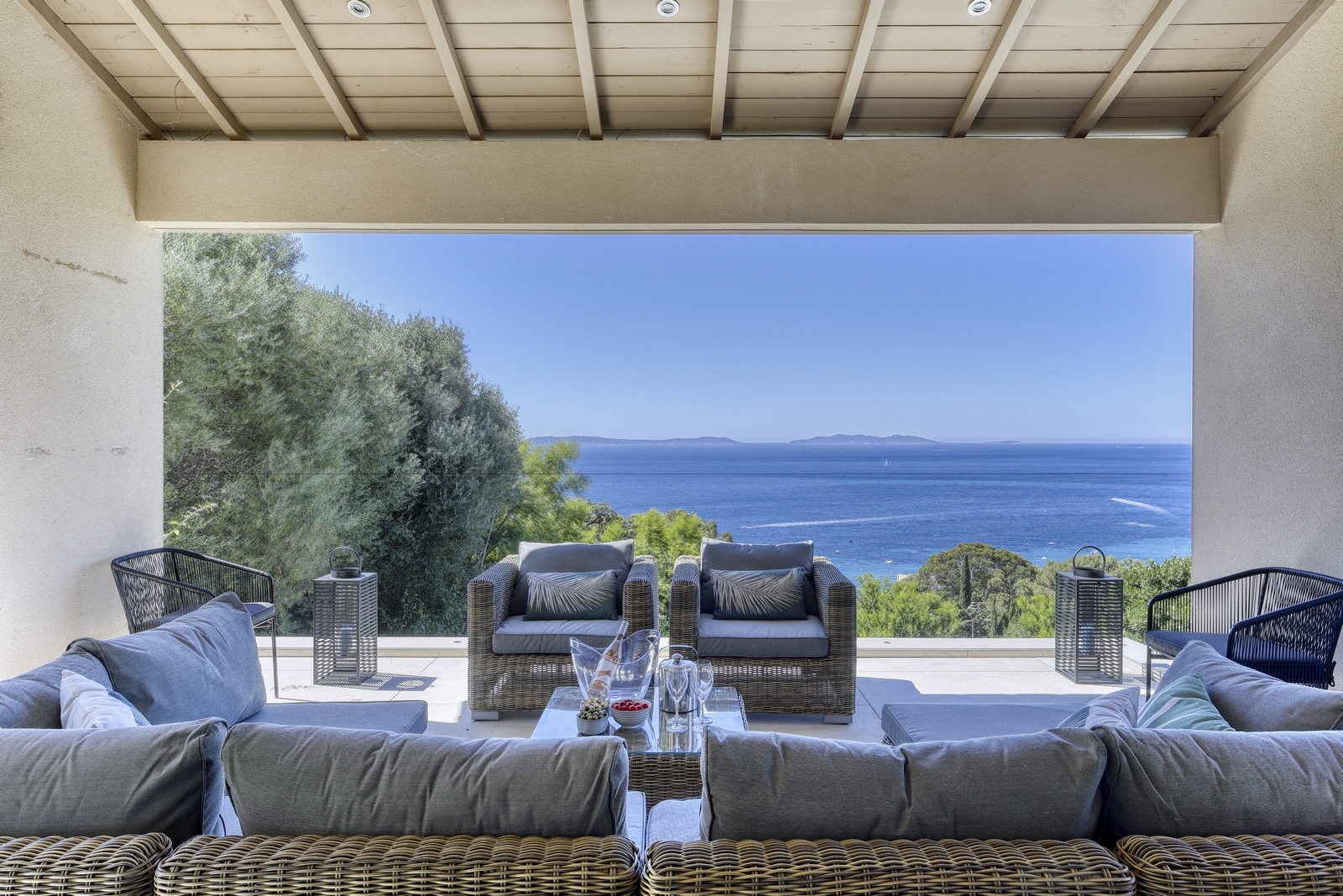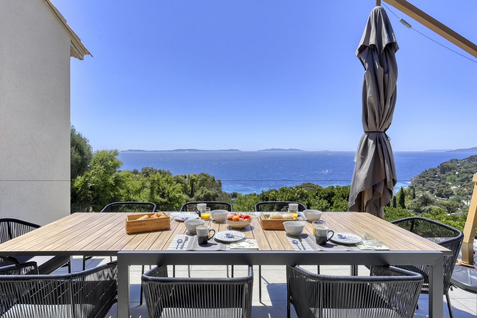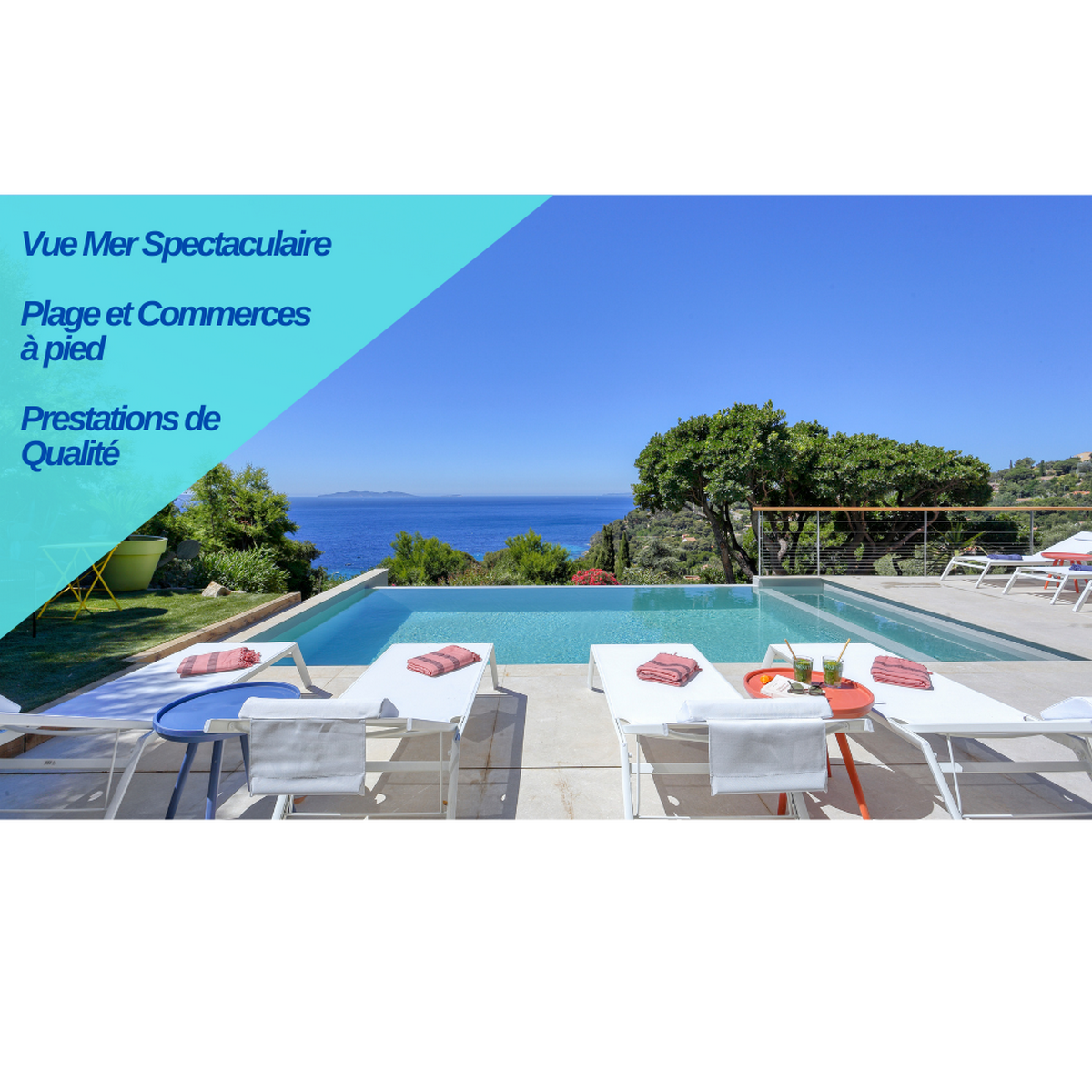Villa de 5 chambres parfaitement équipée et de haut standing. En face des Îles d'Hyères et orientée sud, la vue mer est spectaculaire.