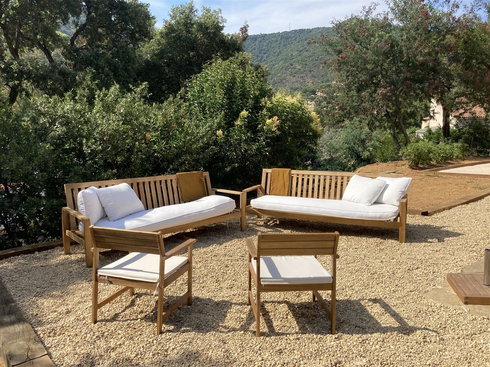 Le jardin, d'une surface de 1900 m2 est plutôt plat, donc confortable avec de jeunes enfants, il est dégagé et offre une jolie vue sur la colline, il est orienté ouest et est ensoleillé de midi jusqu'au soir avec des zones fraiches … La piscine est sur le coté avec une alarme. Tout le mobilier est fait pour accueillir 12 personnes. Le jardin dispose d'une table de ping pong, d'un barbecue gaz et d'un boulodrome !