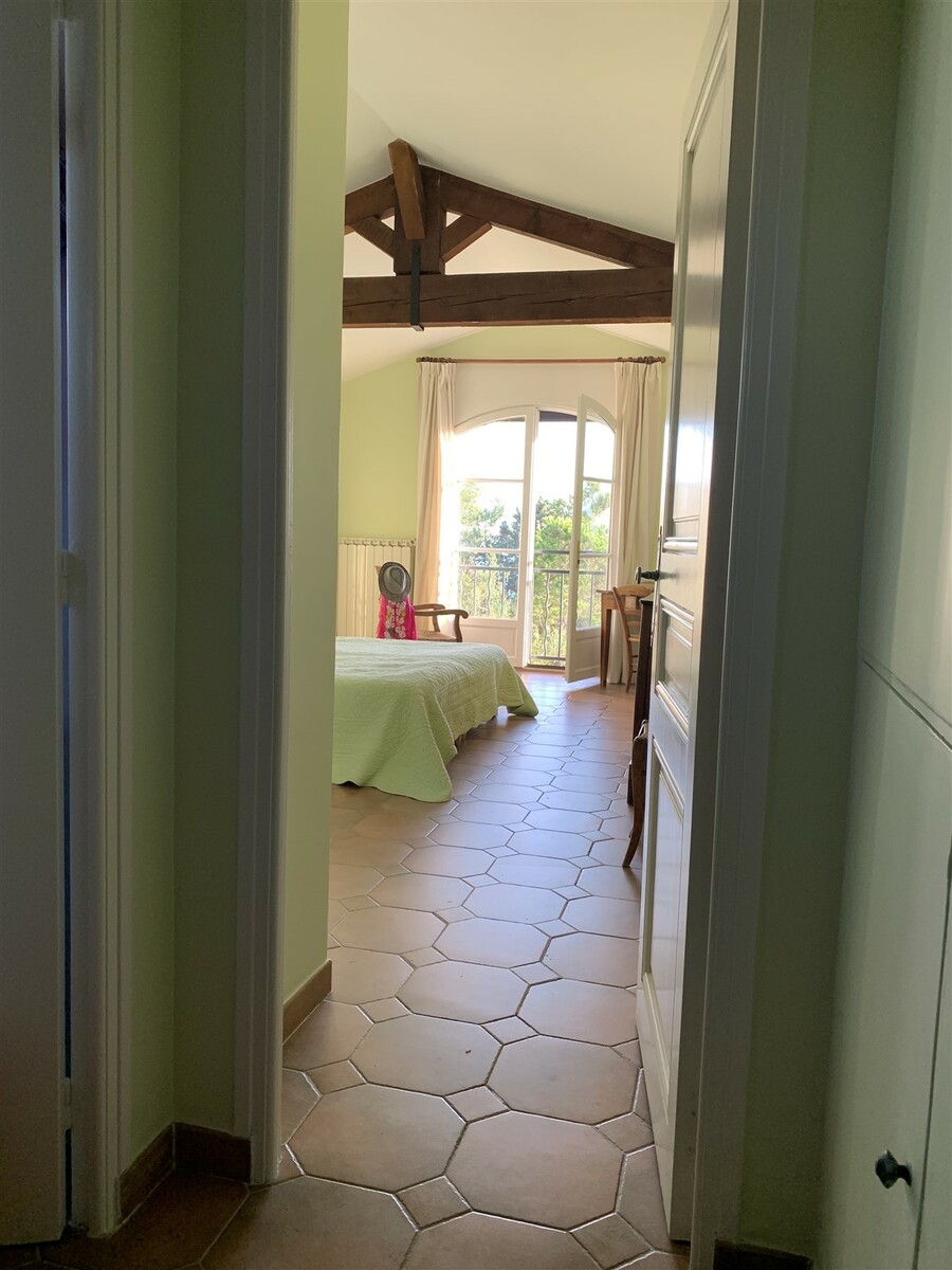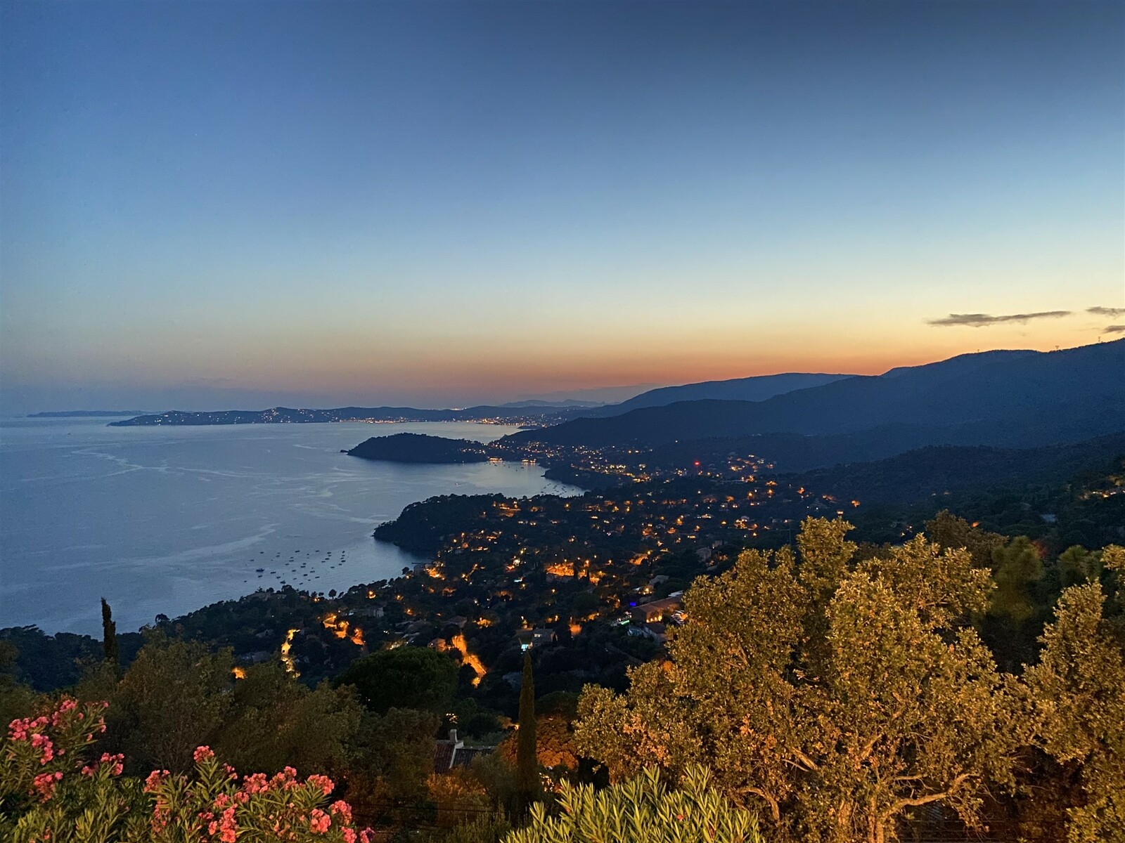 La vue panoramique qu'elle offre depuis son jardin paysager de 2400m2 permet de profiter du décor magnifique du Var, de la mer et les îles d'or.Les 6 chambres donnent sur la piscine et le panorama.