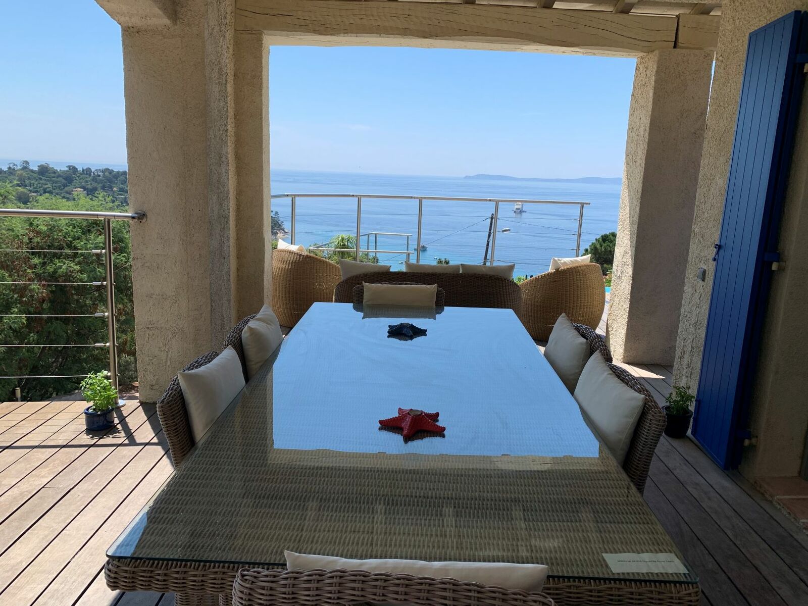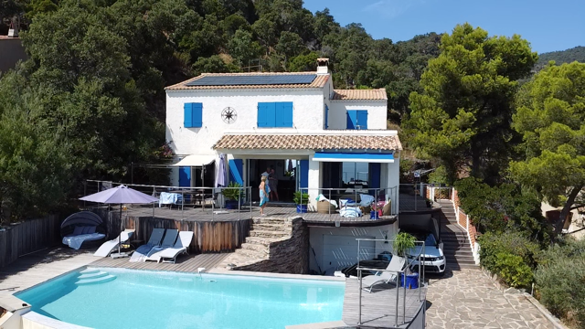 Située au calme dans une impasse.180m², exposée Sud, sur 2100m² de colline boisée, grande terrasse et solarium, pas de vis-à-vis, proximité plage (400m, 800m par route).