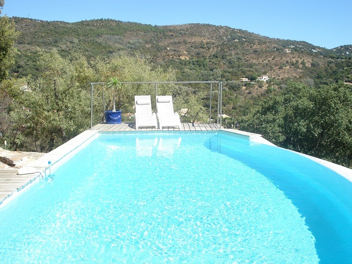 180m², exposée Sud, sur 2100m² de colline boisée, grande terrasse et solarium, pas de vis-à-vis, proximité plage (400m, 800m par route).