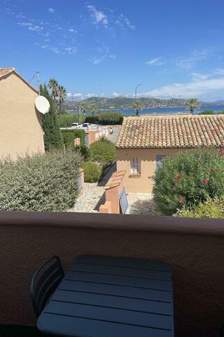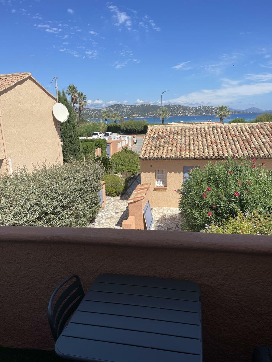 Un balcon de 5 m2 avec vue sur mer, une table et deux chaises.