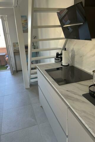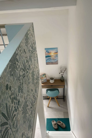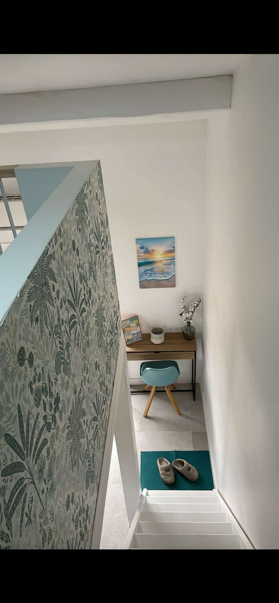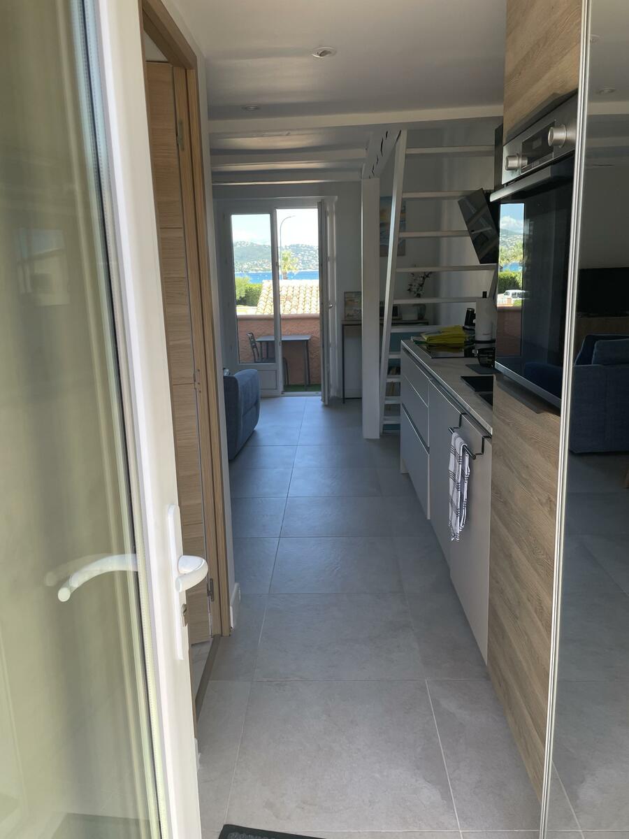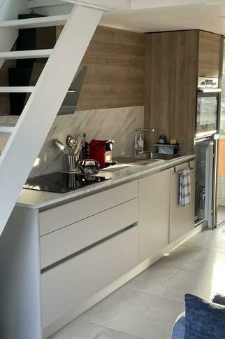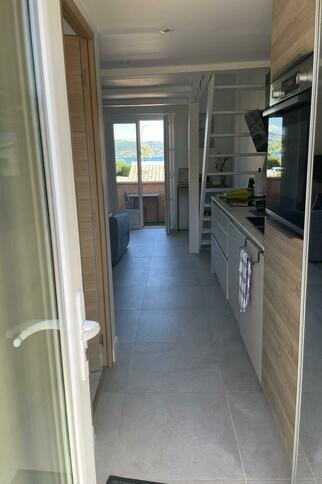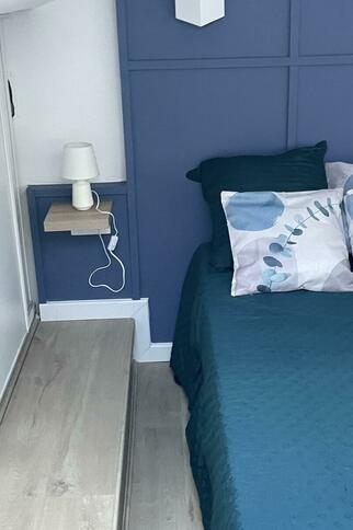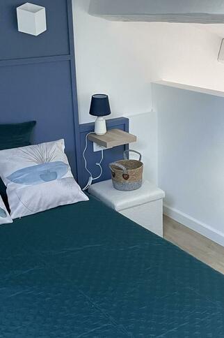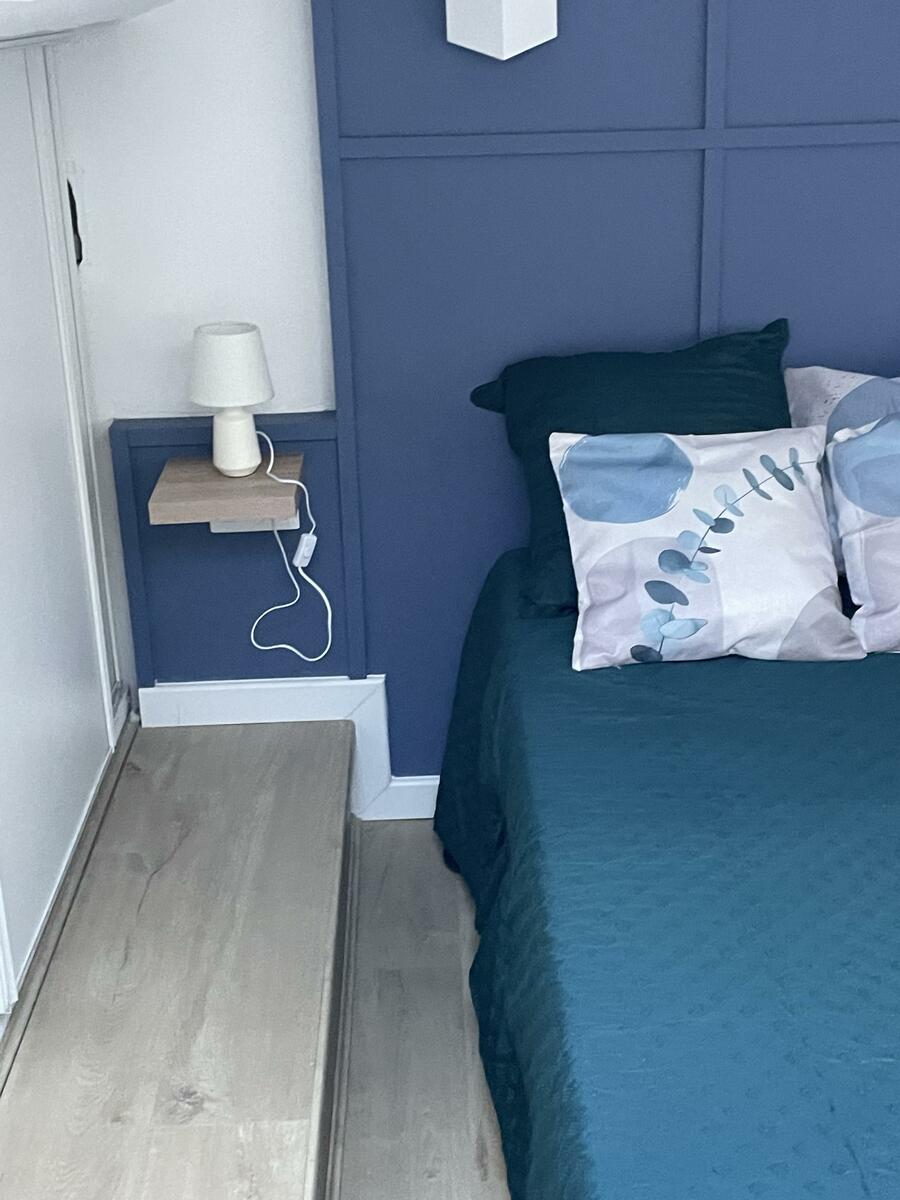 À l'étage, en mezzanine, se trouve une chambre avec un lit pour deux personnes et de grands rangements.