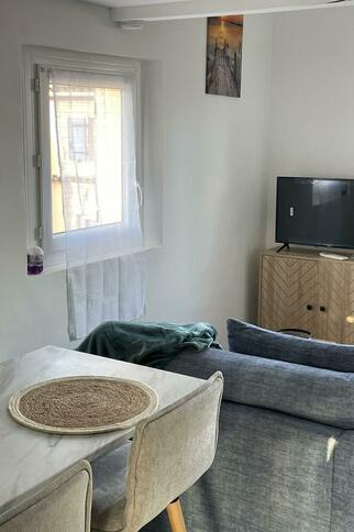 Pièce de vie climatisée avec un coin salon doté d'un canapé et d'une TV.