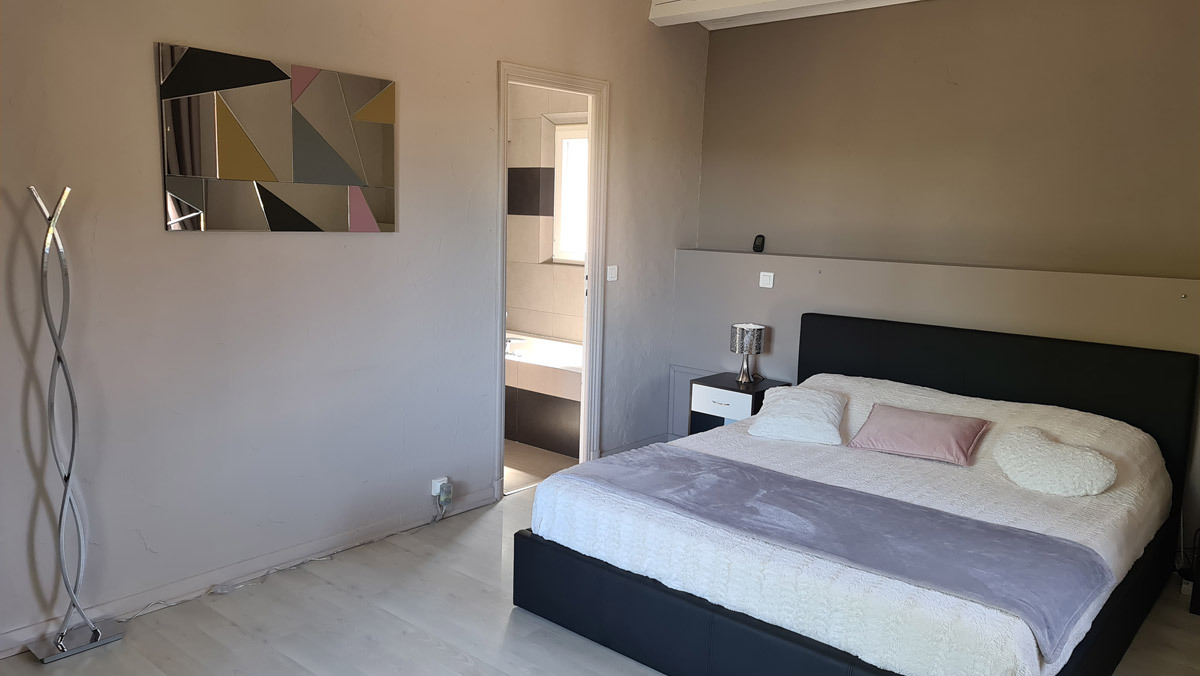 - RDC : entrée, cuisine moderne aménagée et équipée, ouverte sur salon et salle à manger, wc indépendant, spacieuse suite parentale.- Etage : pallier, deux grandes chambres avec lit double 160x200 avec SDB et une avec balcon et vue colline imprenable.