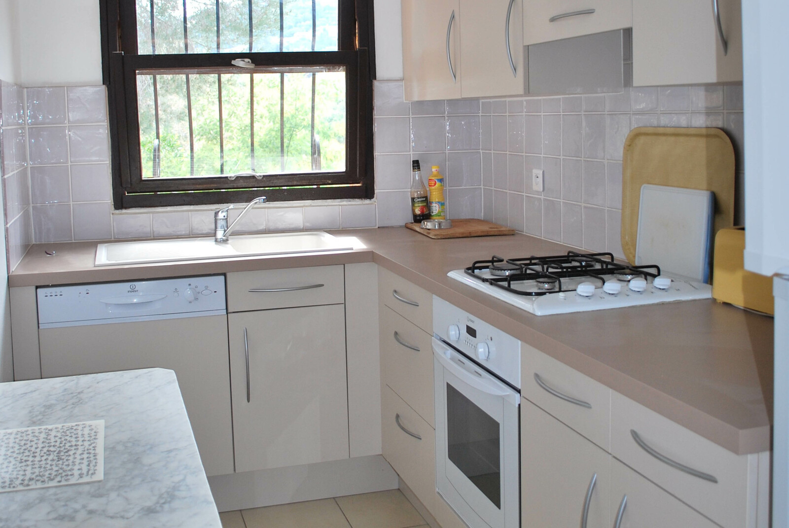 Coté séjour : cuisine ouverte, équipée cuisson gaz, four électrique, four micro-ondes, frigo, congélateur, lave-vaisselle, lave-linge. TV TNT SAT.