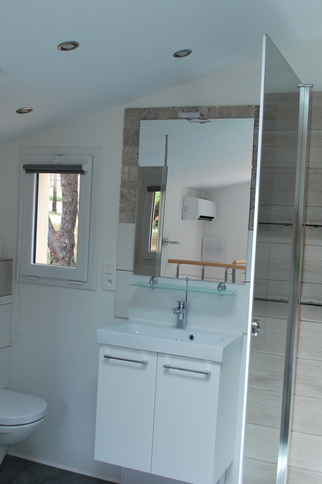 Coté salle de bain : Douche, lavabo, toilettes séparées.