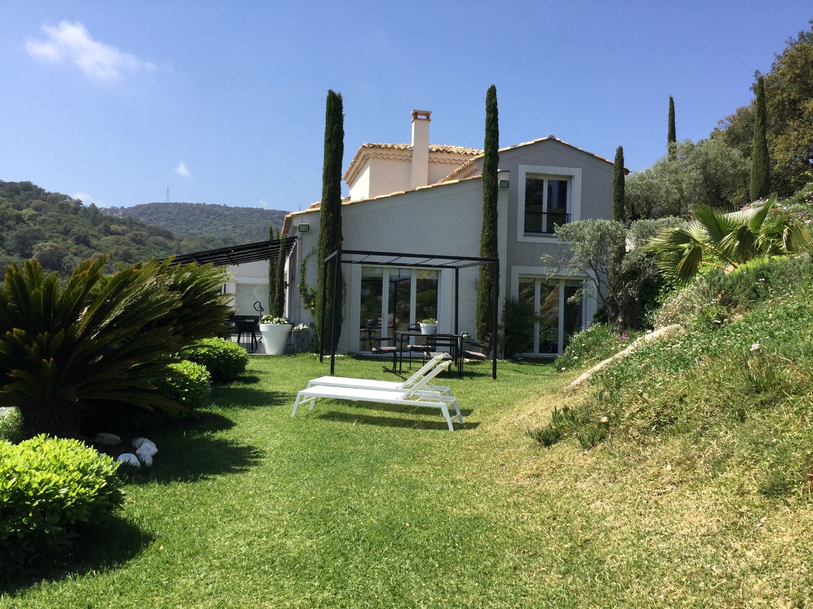Superbe villa contemporaine dans les collines de Grimaud, louée entièrement et exclusivement à un seul client , classée 5*****, avec vue panoramique sur le golfe et le village de Saint-Tropez.La maison est conçue pour accueillir 8 personnes, 2 adultes et 2 enfants supplémentaires peuvent loger dans un appartement avec un lit double et un canapé-lit confortable (140 cm) dans le salon de la suite piscine.